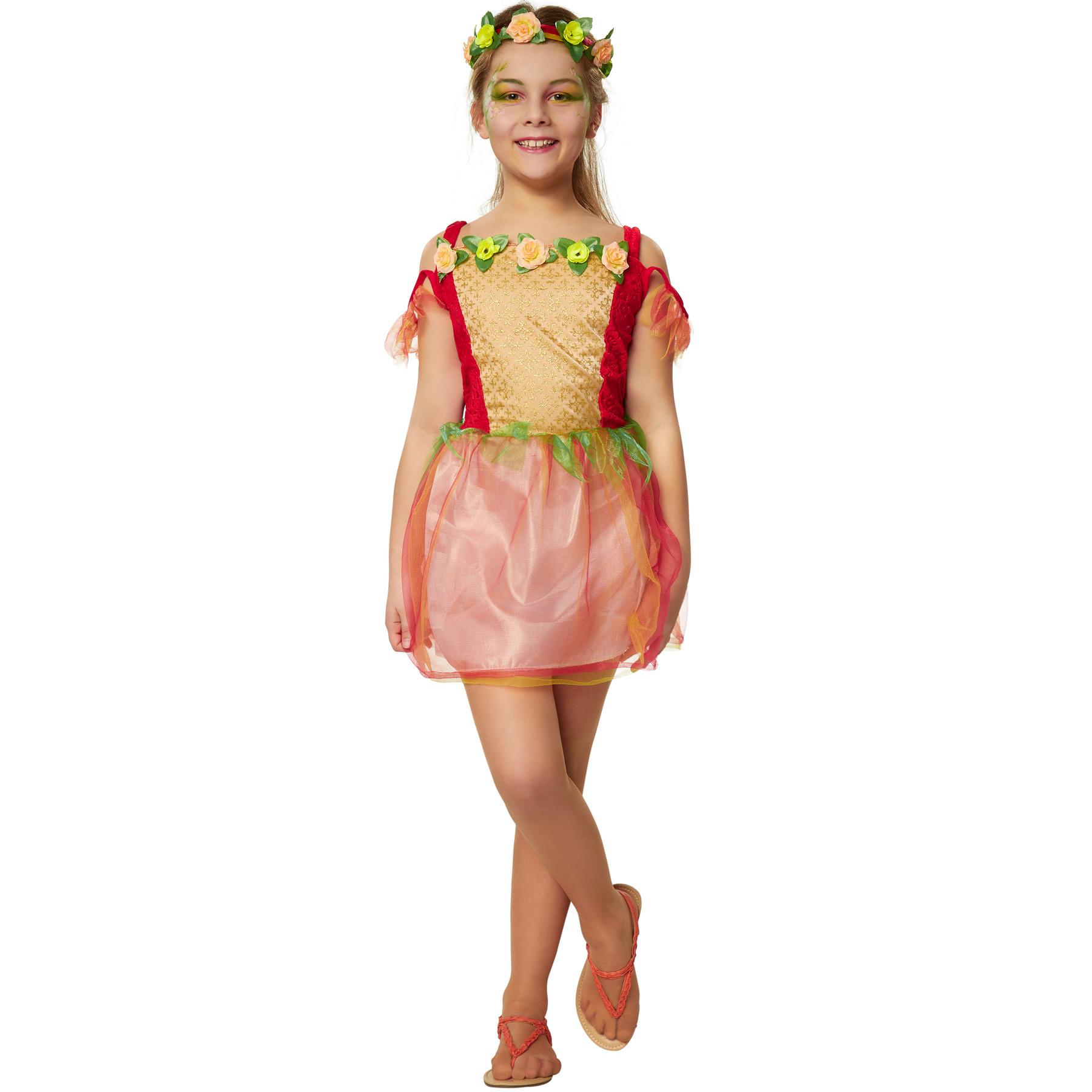 Il costume per bambina/ragazza da fata dei fiori si compone di un abito con spalline, corona di fiori sulla scollatura e maniche corte in pizzo di tulle. Il corpino è decorato sul davanti con un motivo ornamentale dorato,