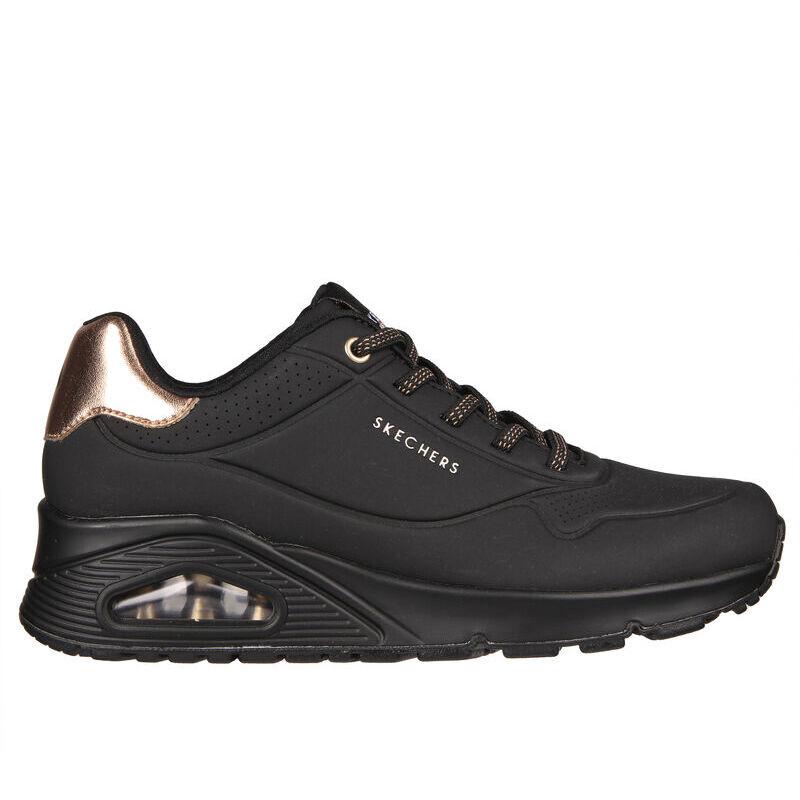 Queste sneakers combinano uno stile atletico classico con un comfort moderno. Il design presenta una tomaia sintetica liscia con accenti metallici, creando un look alla moda. La soletta Air-Cooled Memory Foam offre un'ammortizzazione eccezionale, mentre l'intersuola visibile Skech-Air con cuscino d'aria aggiunge ulteriore comfort e supporto.
