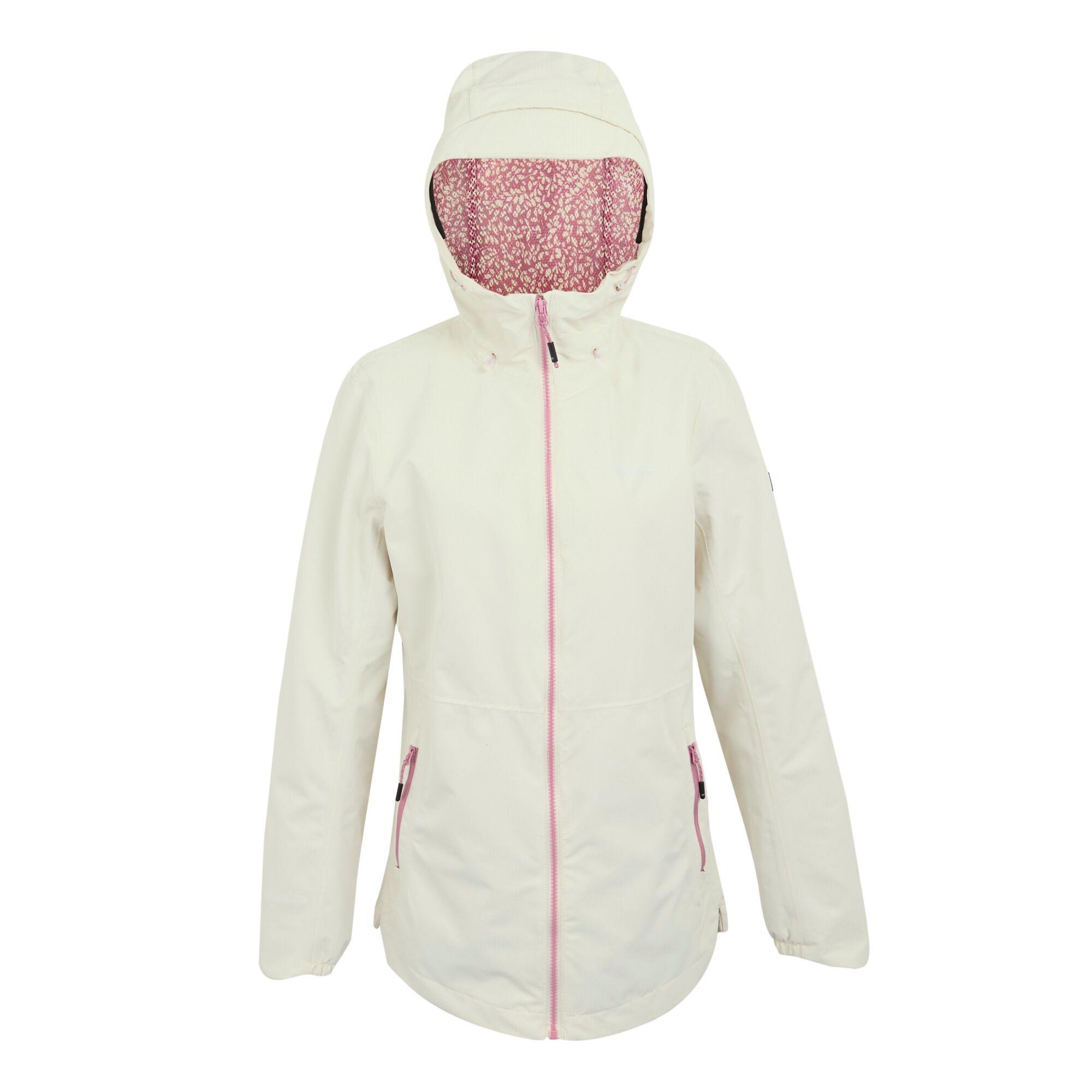 La giacca impermeabile Hamara IV è progettata per le avventure all'aria aperta, offrendo una protezione affidabile dagli elementi. Questa giacca presenta una costruzione impermeabile per mantenere chi la indossa asciutto e comodo in varie condizioni meteorologiche. Il design include una cerniera frontale completa con una cerniera rosa a contrasto, aggiungendo un tocco di stile al suo fascino funzionale. Il cappuccio è dotato di una coulisse regolabile per una vestibilità sicura, e la fodera interna del cappuccio mostra un sottile motivo floreale, fornendo un dettaglio unico.