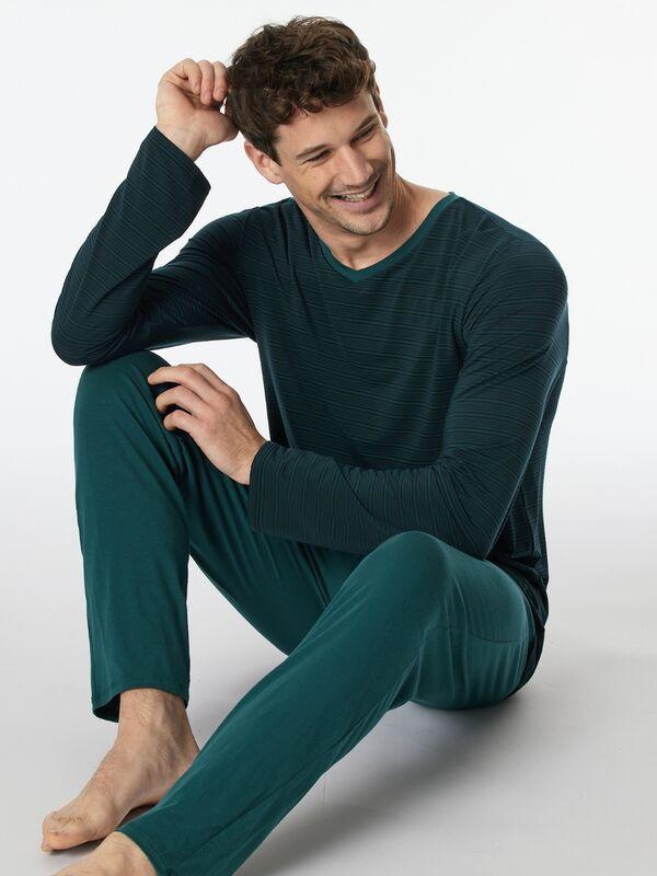 Questo pigiama offre un comfort eccezionale per un sonno riposante. La maglia presenta uno scollo a V e maniche lunghe, mentre i pantaloni sono progettati per una vestibilità rilassata. Il morbido tessuto MicroModal offre una sensazione lussuosa sulla pelle.