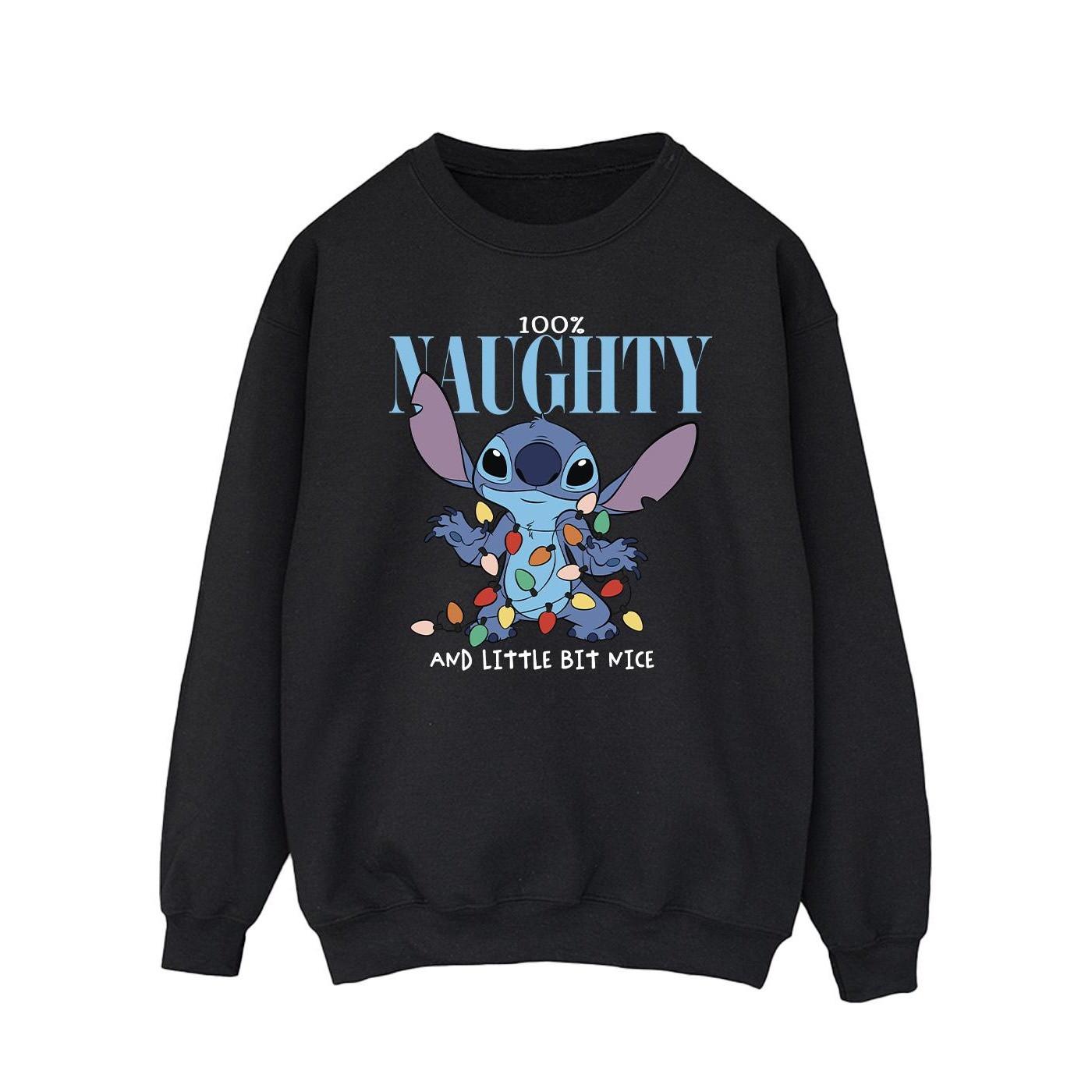 Questa felpa presenta un design giocoso con Stitch di Lilo & Stitch della Disney, adornato con luci festive e la scritta "100% NAUGHTY AND LITTLE BIT NICE". È una scelta comoda ed elegante per l'abbigliamento casual.
