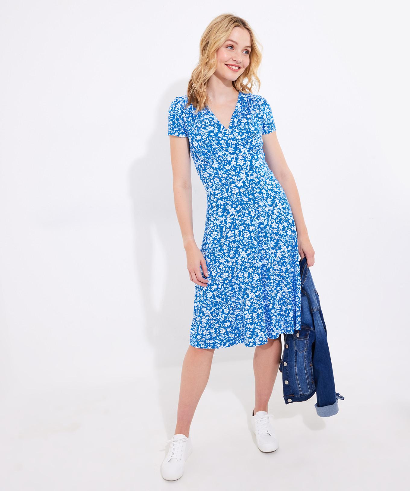 Questo abito in jersey è un capo essenziale per l'estate, caratterizzato da un design incrociato lusinghiero e una stampa floreale stagionale all-over. Il taglio a metà polpaccio e le maniche corte lo rendono un capo versatile per varie occasioni.