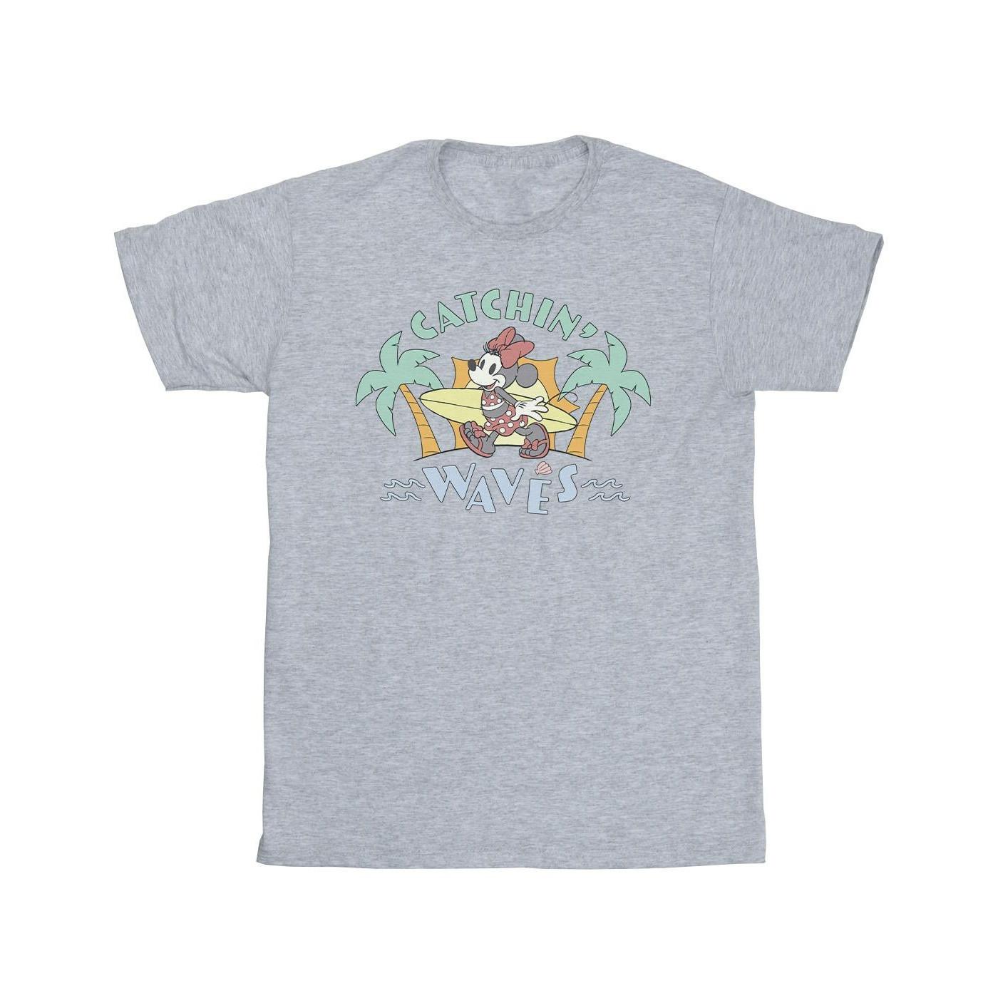 Questa T-shirt presenta una stampa grafica giocosa di un personaggio che fa surf, circondato da palme e dalla scritta "Catchin' Waves". Il design evoca un'atmosfera rilassata e estiva, rendendola una scelta adatta per l'abbigliamento casual. È un prodotto con licenza ufficiale e realizzato in un tessuto di peso medio.