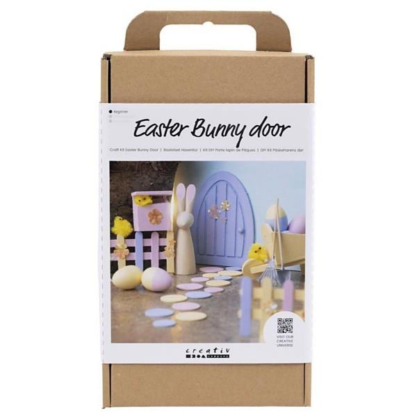 Contenuto: porta, lepre, cassetta delle lettere, rastrello, vanga, carriola, pulcini, uova di plastica, fiori di lustrini, dischi di legno, bastoncini per ghiaccioli, bastoncini per fiori, Plus Colour per vernice artigianale, pennello e colla.