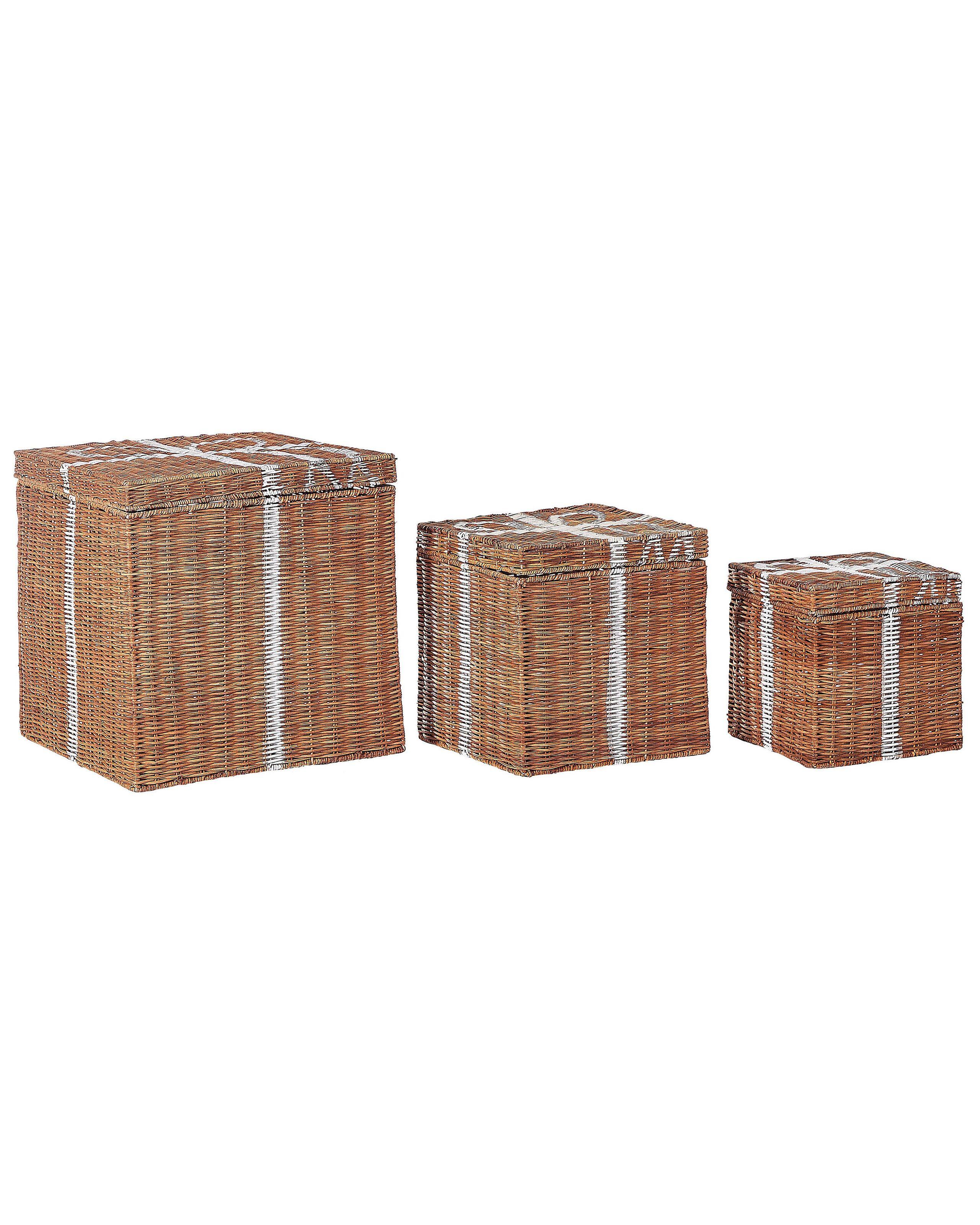 Scatole regalo decorative in rattan. Con queste scatole portaoggetti a tema rustico, potrai tenere organizzato il tuo spazio vitale ed esaltare le tue decorazioni natalizie. Realizzato a mano in rattan, il set è molto resistente e richiede una facile manutenzione per durare molti anni. Assomigliano a regali ben confezionati, quindi i tuoi ospiti ne rimarranno sicuramente affascinati. Ogni scatola ha dimensioni diverse, quindi può essere utilizzata per riporre vari oggetti, dalle decorazioni natalizie alle cose di tutti i giorni, se si vuole prolungare l'atmosfera festiva in casa.