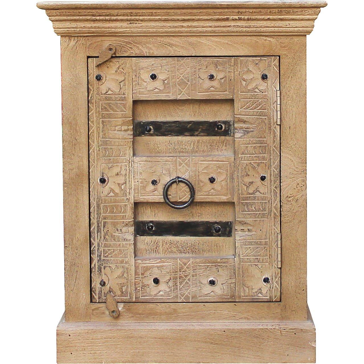 Elaborati intagli su legno di mango con applicazioni in metallo conferiscono al frontale di questo comodino l'antico aspetto coloniale tipico dell'India. Dietro l'anta del comodino c'è spazio per libri e oggetti personali. Il ripiano superiore offre spazio sufficiente per una lampada da comodino, una sveglia, libri, occhiali da lettura, ecc. Il comodino può essere utilizzato anche come pezzo a sé stante in altri ambienti, ad esempio come mobile da corridoio o piccola cassettiera da ingresso, in cui può davvero emergere con il suo fascino. La cassettiera può essere abbinata a mobili moderni nelle camere da letto. Il mobile sarebbe altrettanto efficace come riempimento di un'alcova in piccoli nuclei familiari singoli.Colore: naturaleMateriale: legno di mango1 ripiano, dimensioni del vano interno: 43,5x37x31,5 cmdecorato con intagli elaborati1 anta con ripiano per riporre gli oggetti chiusi
