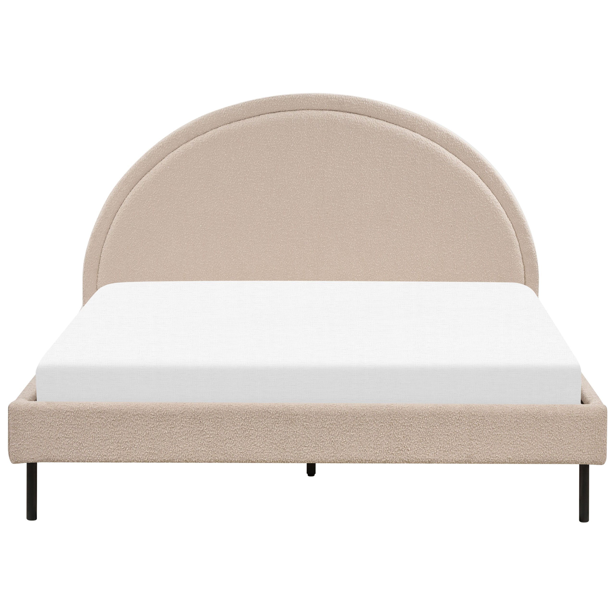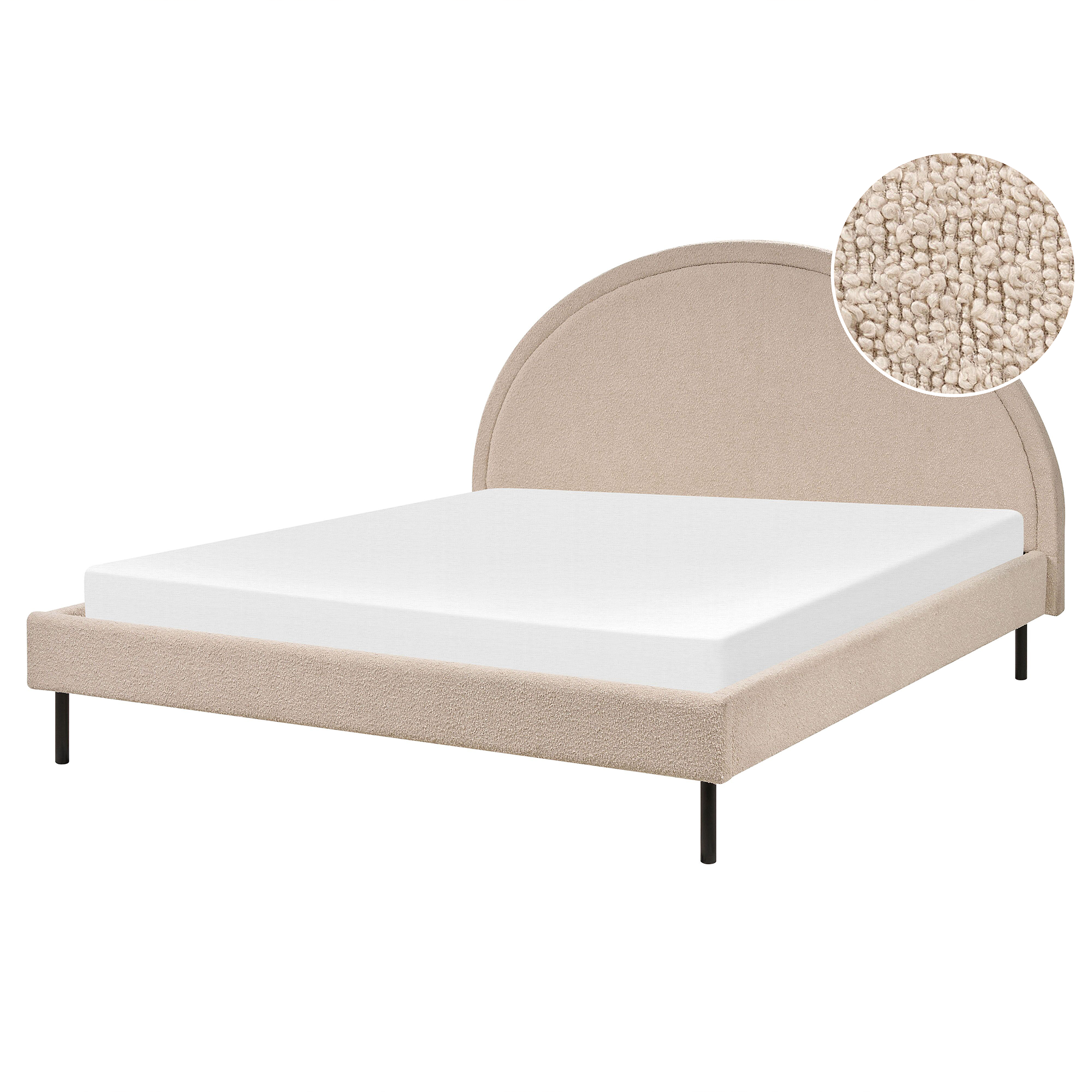 Letto minimalista con testata semicircolare. Arreda la tua camera da letto con questo elegante letto dal design minimalista con testiera semicircolare. Realizzato in tessuto boucle, è noto per la sua morbidezza e lo straordinario comfort. La sua estetica universale si adatta perfettamente a qualsiasi ambiente. Scopri il perfetto connubio tra eleganza e comfort che questo letto offre, mentre la rete a doghe inclusa garantisce un sostegno e una durata eccellenti. Inoltre, non richiede cure particolari per poter godere di un meraviglioso luogo di relax a lungo.