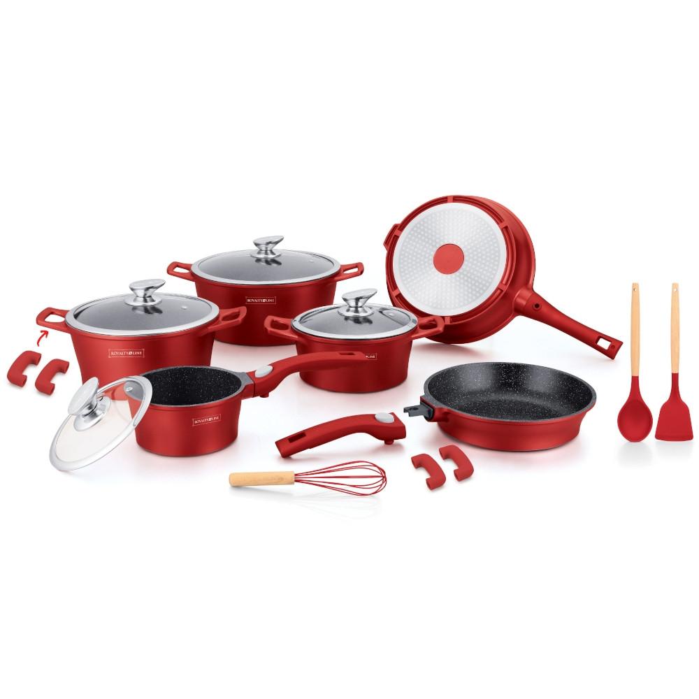In questo set di pentole troverai pentole, padelle e una casseruola. Sono realizzati in pressofusione di alluminio e ricoperti da una superficie antiaderente. Le pentole hanno manici staccabili o manici in silicone. È una caratteristica molto apprezzata dagli chef professionisti in quanto permette di spostare la padella dal fornello direttamente al forno, risparmiando tempo e stoviglie. Le pentole funzionano sulla maggior parte dei tipi di fornelli, compresi i piani cottura a induzione.