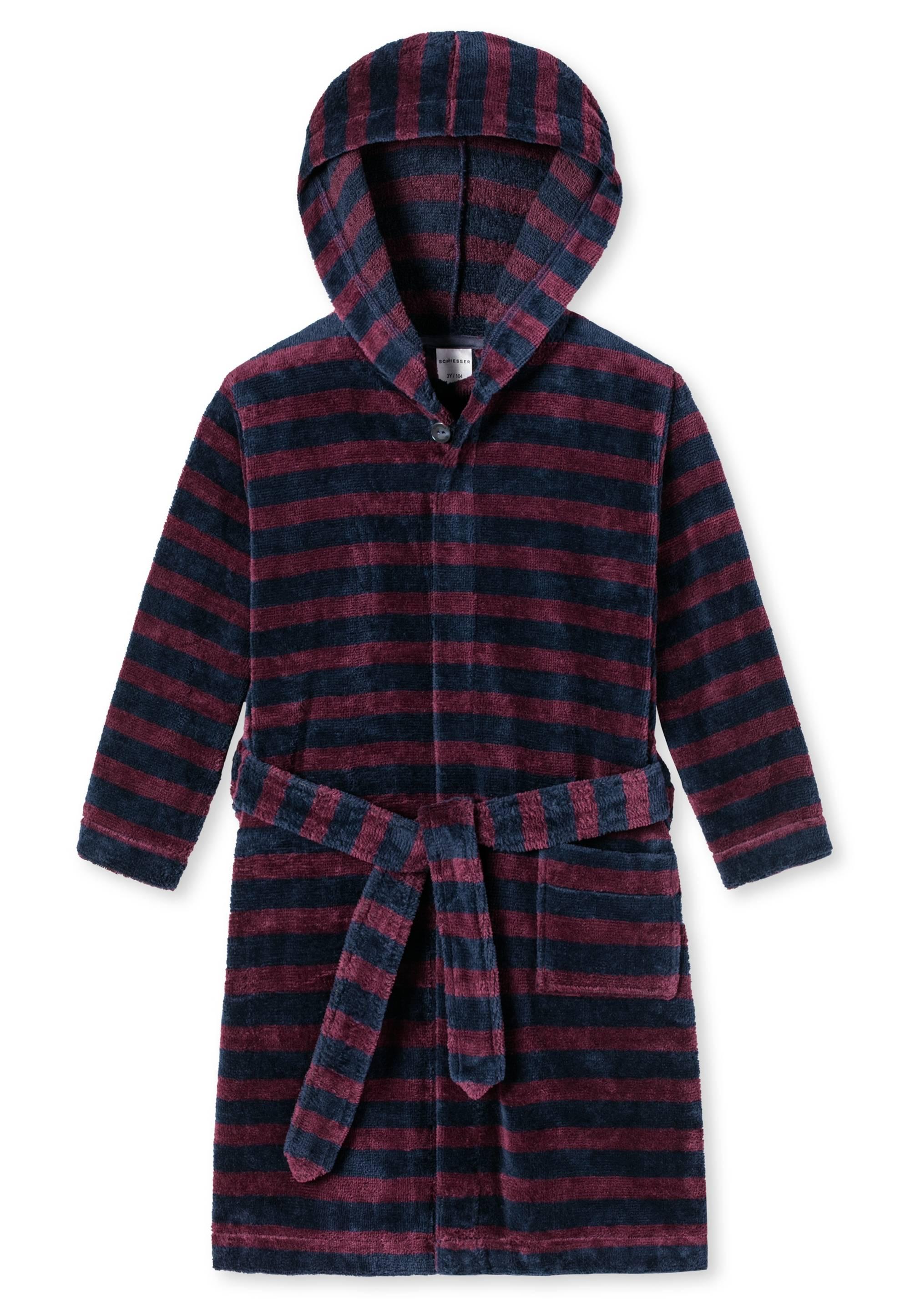 Accappatoio a righe per ragazzi del marchio SCHIESSER. Con tasca applicata, cintura da annodare e cappuccio. Comodo e morbido misto cotone.