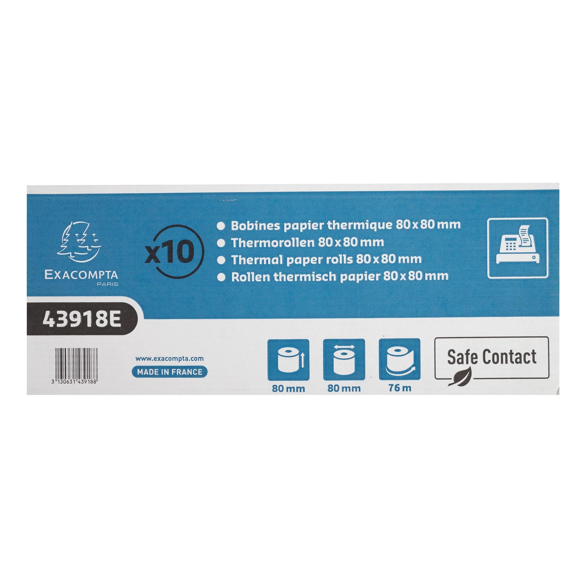 Dimensioni del rotolo: 80 mm di larghezza e 80 mm di diametro. Metratura (circa 2mt): 76mt. Mandrino standard da 12mm.avviso di fine rotolo. Con menzione safe contact sul retro e logo exacompta Novità brevettata: la stampa si ottiene per reazione fisica e non per reazione chimica come accade per la carta termica standard. I rotoli safe contact non contengono rilevatori chimici, nè bpa ne altri tipi di fenolo non sono quindi nociviper la salute e sono anche approvati per il contatto diretto con gli alimenti (conformi alle raccomandazioni del bfr xxxvi). Rotoli prodotti a partire da carta leggermente azzurrata non teme nè il calore, nè la luce, ne l'umidità fattore che garatisce una stampa a lunga durata. Il testo stampato sugli scontrini resta visibile almeno per 35 anni. Carta eco-responsabile, certificata fsc® e riciclabile dai rifiuti della carta. Produzione francese. Confezionamento secondario in confezione di cartone richiudibile per una migliore protezione e un'archiviazione facile confezione da 10 rotoli