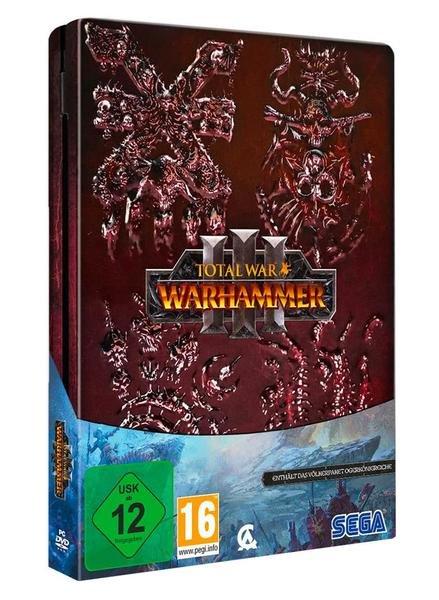 Edizione limitata in scatola di metallo goffrato, poster fronte/retro con carta della campagna di Warhammer III e illustrazione di copertina, adesivi con simboli del caos e DLC "Oger Kingdoms Pack".