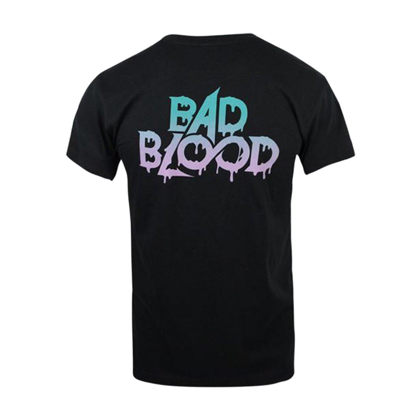 Questa T-shirt presenta una sorprendente stampa grafica sul retro, che mostra un grande disegno a croce con pipistrelli, stelle e due figure stilizzate. La parte anteriore della maglietta mostra il logo "Bad Blood" con una sfumatura di colore. Questo capo offre una dichiarazione audace per l'abbigliamento casual.