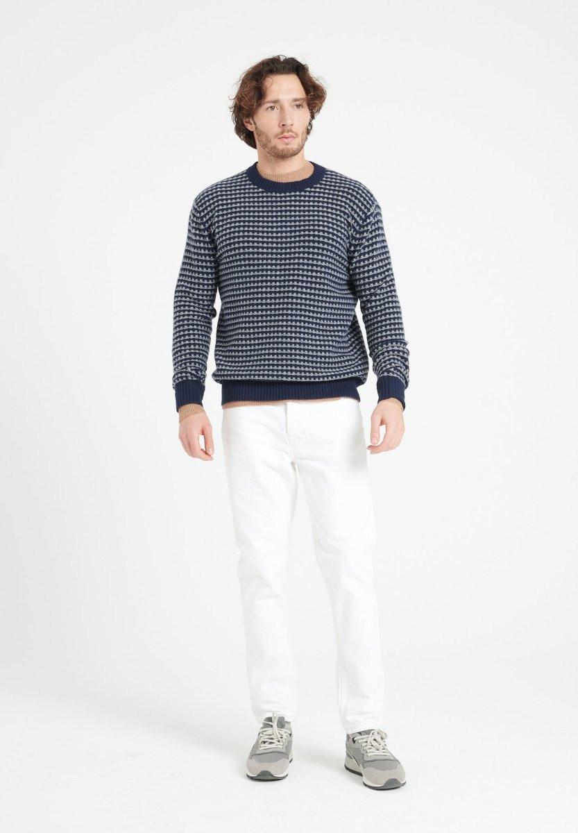 Questo maglione girocollo a 4 fili è realizzato in cashmere morbido e caldo, con un originale motivo jacquard. Presenta una vestibilità rilassata e finiture a costine. Questo capo versatile può essere indossato con jeans o pantaloni sartoriali.