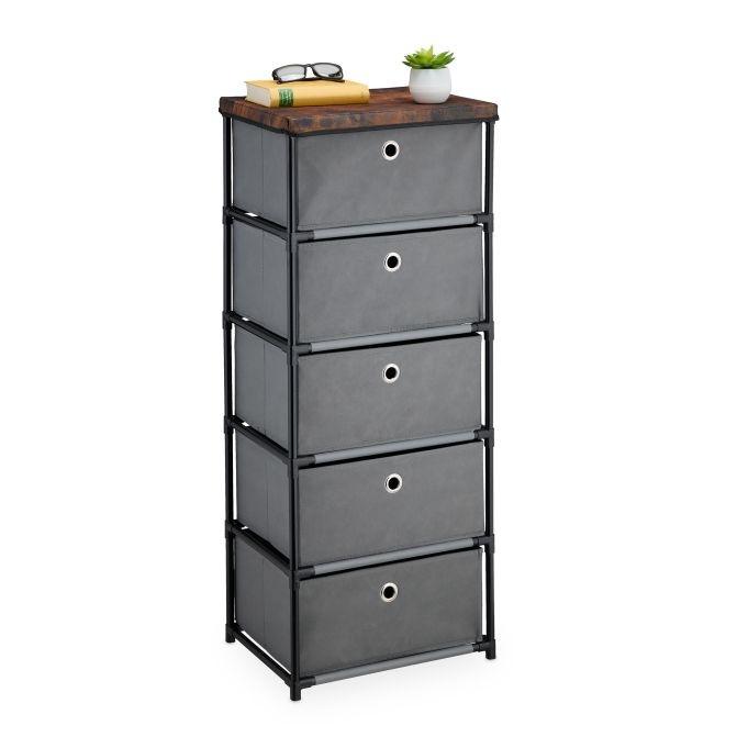 - Materiale: Struttura in metallo nero, ripiano effetto legno vintage, cassetti in tessuto