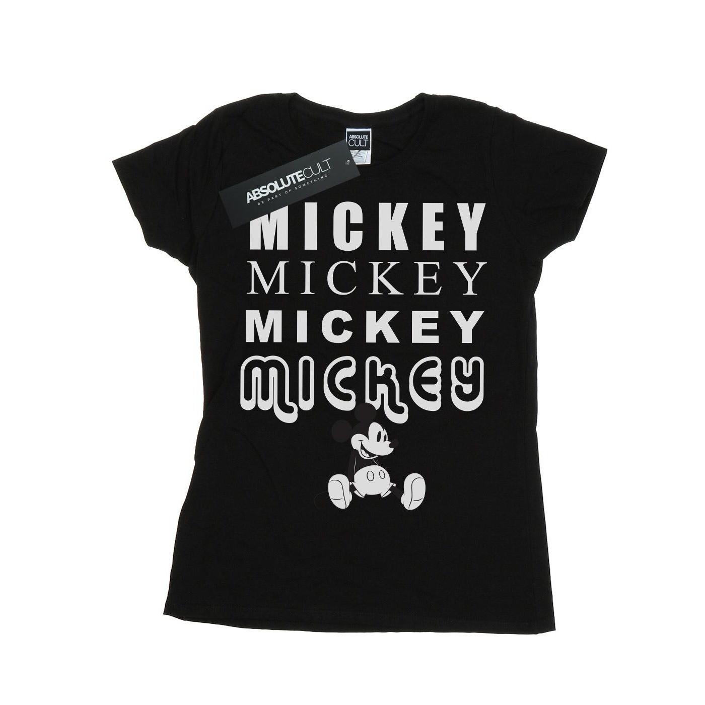 Questa T-shirt presenta un classico girocollo e maniche corte, offrendo una vestibilità comoda e versatile. Il design mostra un logo "Mickey" ripetuto, con l'ultima iterazione che presenta un carattere stilizzato e un'immagine di Topolino stesso.