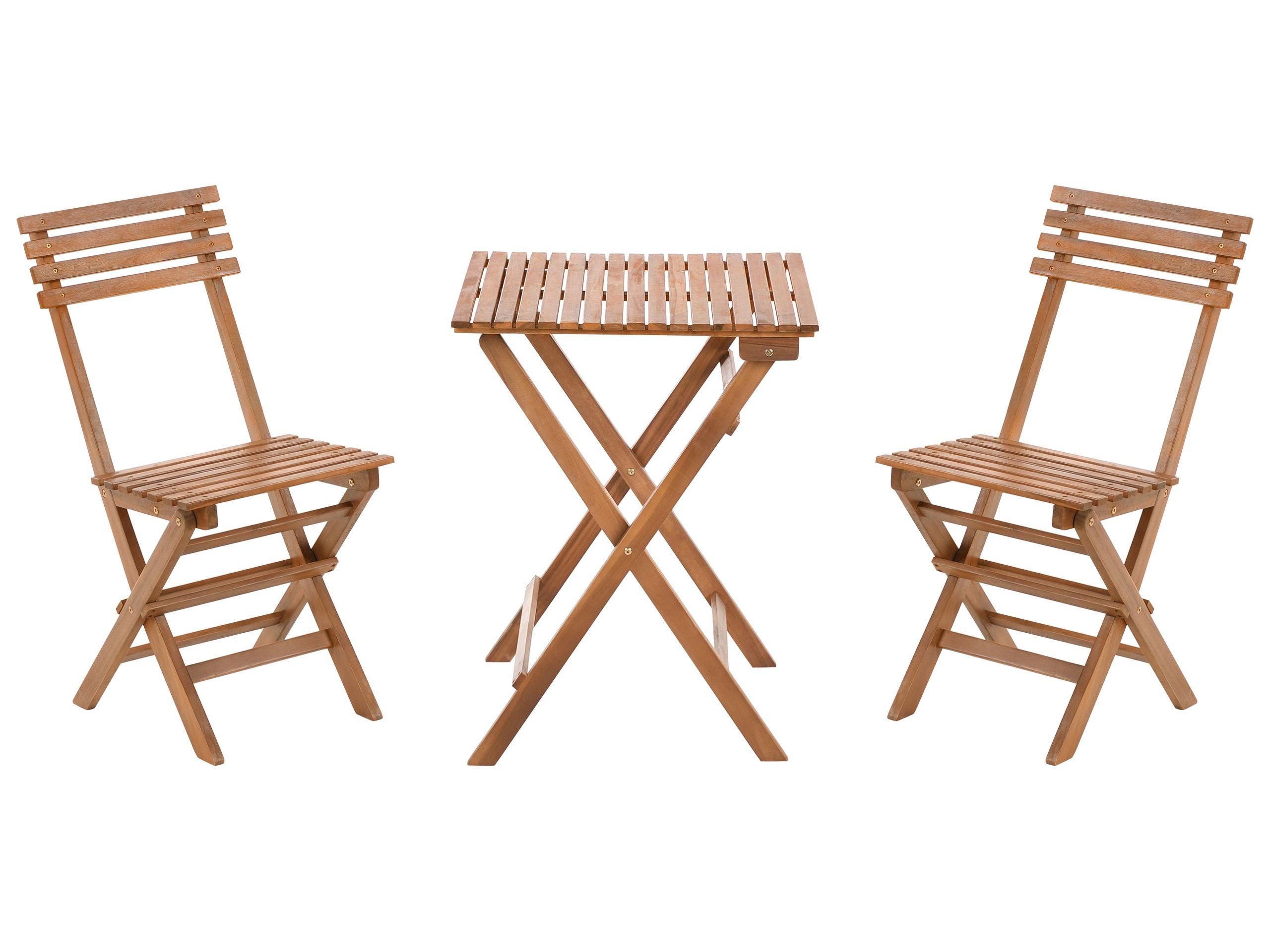 Set di sedie e tavolo pieghevoli per balcone. Goditi il caffè del mattino o un drink serale con stile grazie a questo affascinante set bistrot. Realizzato in legno di acacia, unisce un design rustico a una finitura elegante, adattandosi a diversi stili di arredamento. Le sedie e il tavolo pieghevoli offrono una soluzione pratica per riporli e spostarli facilmente, perfetti per terrazzi o balconi di piccole dimensioni. Un'aggiunta pratica, resistente e di stile a qualsiasi spazio esterno.