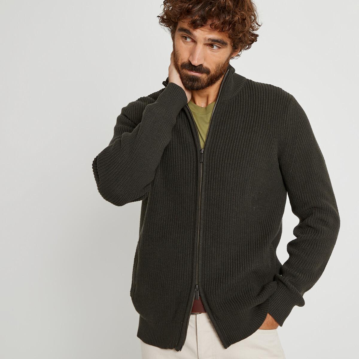 Questo cardigan in cotone biologico offre un'opzione di stratificazione comoda ed elegante. Presenta una cerniera frontale completa e un collo alto, rendendolo un'aggiunta versatile a qualsiasi guardaroba.