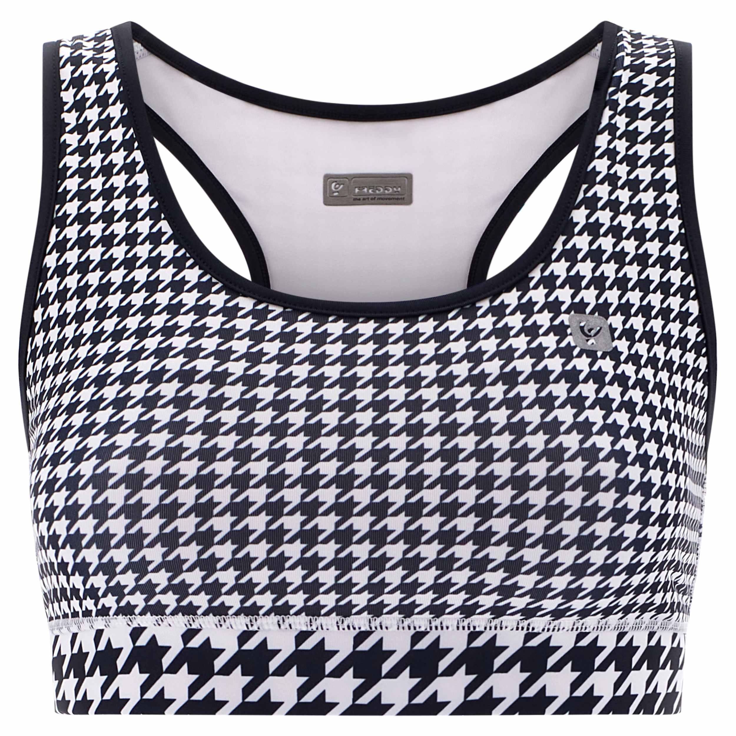 Reggiseno sportivo in tessuto tecnico traspirante ecologico con stampa a fantasia all over e logo Freddy glitter sul fronte. Il logo stampato sulla parte posteriore certifica il tessuto. Ha sostegno medio, scollo a girocollo e retro a vogatore che dona ampiezza di movimento. Capo perfetto per le attivitÇÿ sportive intense grazie al suo design e al tessuto D.I.W.O. recycled brevettato da Freddy ottenuto da bottiglie di plastica trasformate in fibra in grado di offrire maggiore traspirabilitÇÿ e di favorire la termoregolazione della pelle.