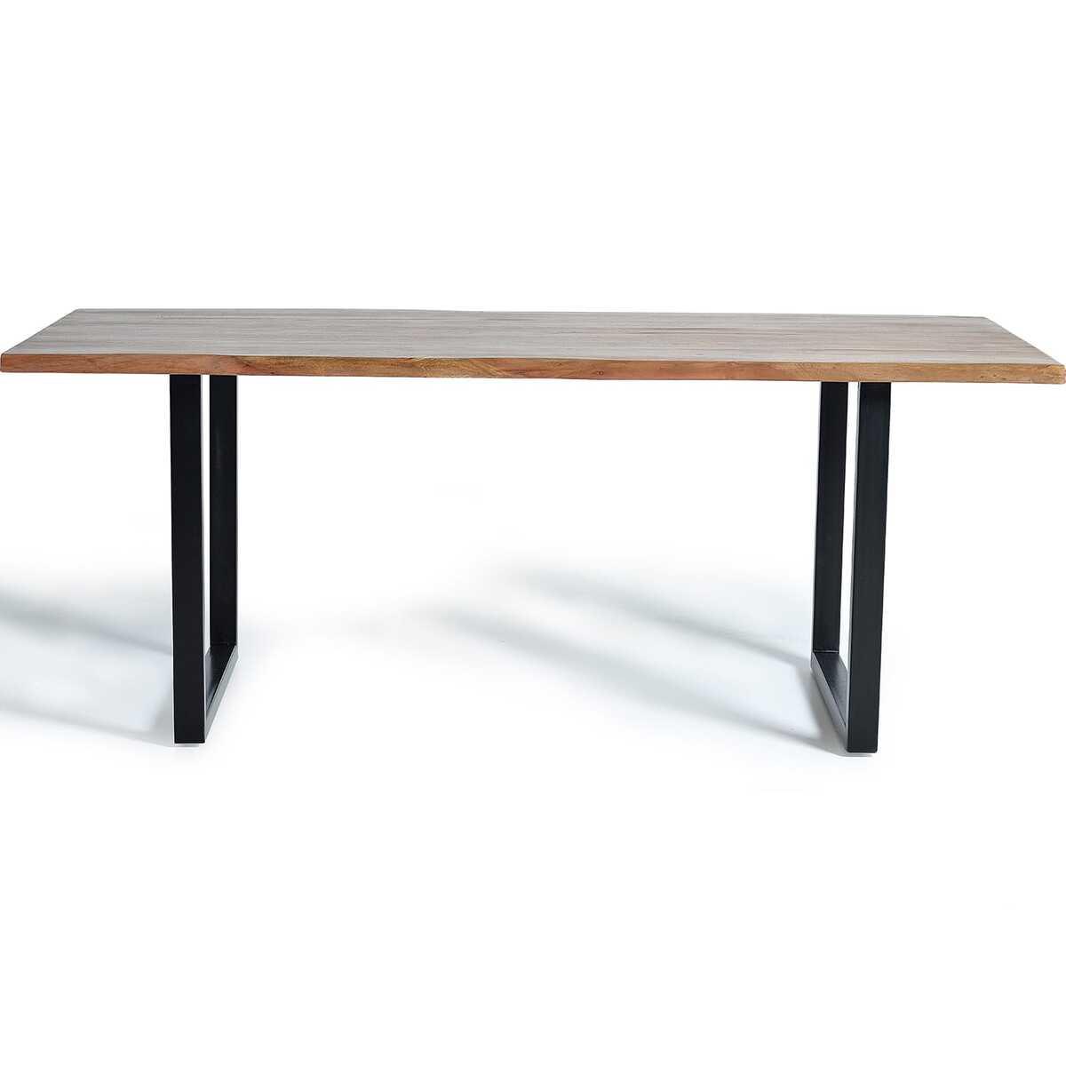 Tavolo da pranzo con piano in legno di acacia e gambe in metallo.