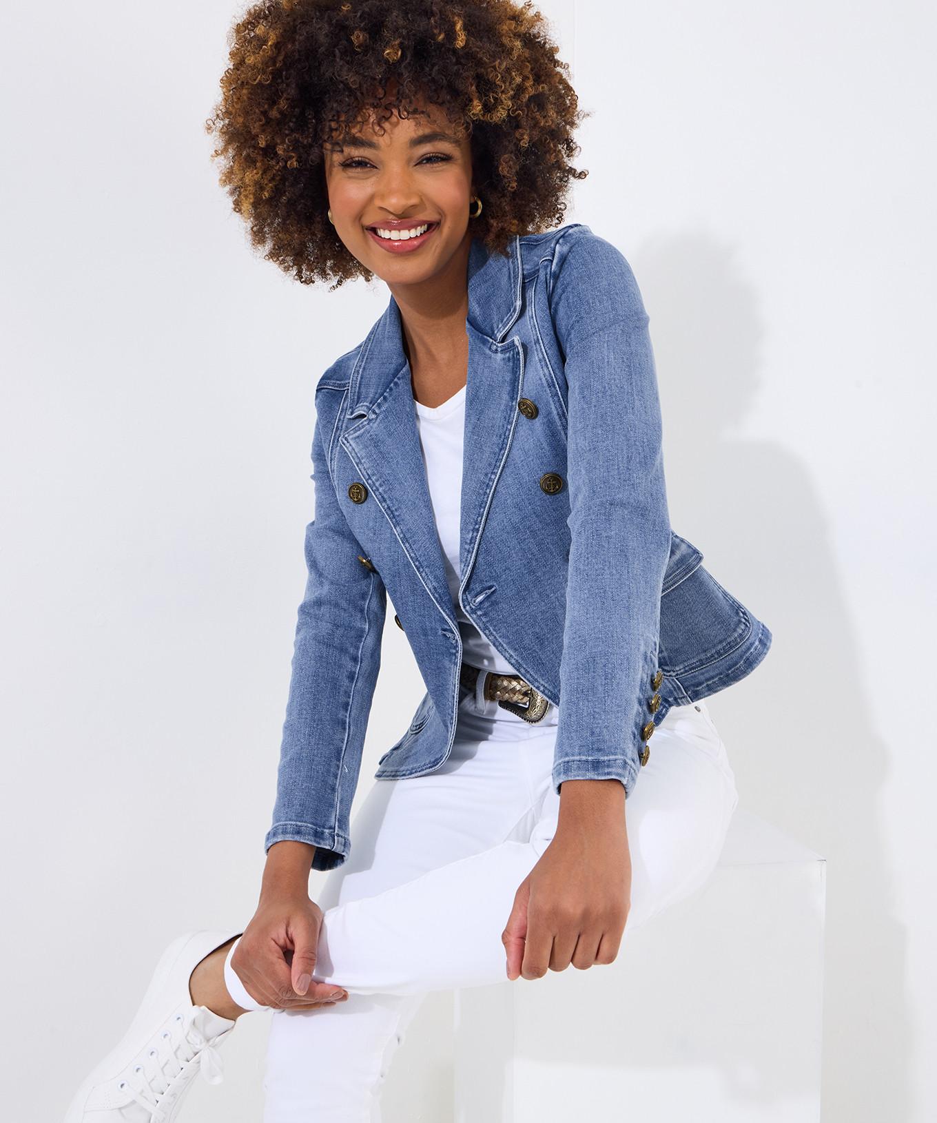 Questo blazer in denim stretch casual offre un'aggiunta elegante e confortevole a qualsiasi guardaroba. Il design a doppio petto con bottoni decorativi a forma di ancora conferisce un look distintivo di ispirazione nautica. La sua vestibilità sartoriale e il tessuto elasticizzato assicurano una silhouette lusinghiera e facilità di movimento.