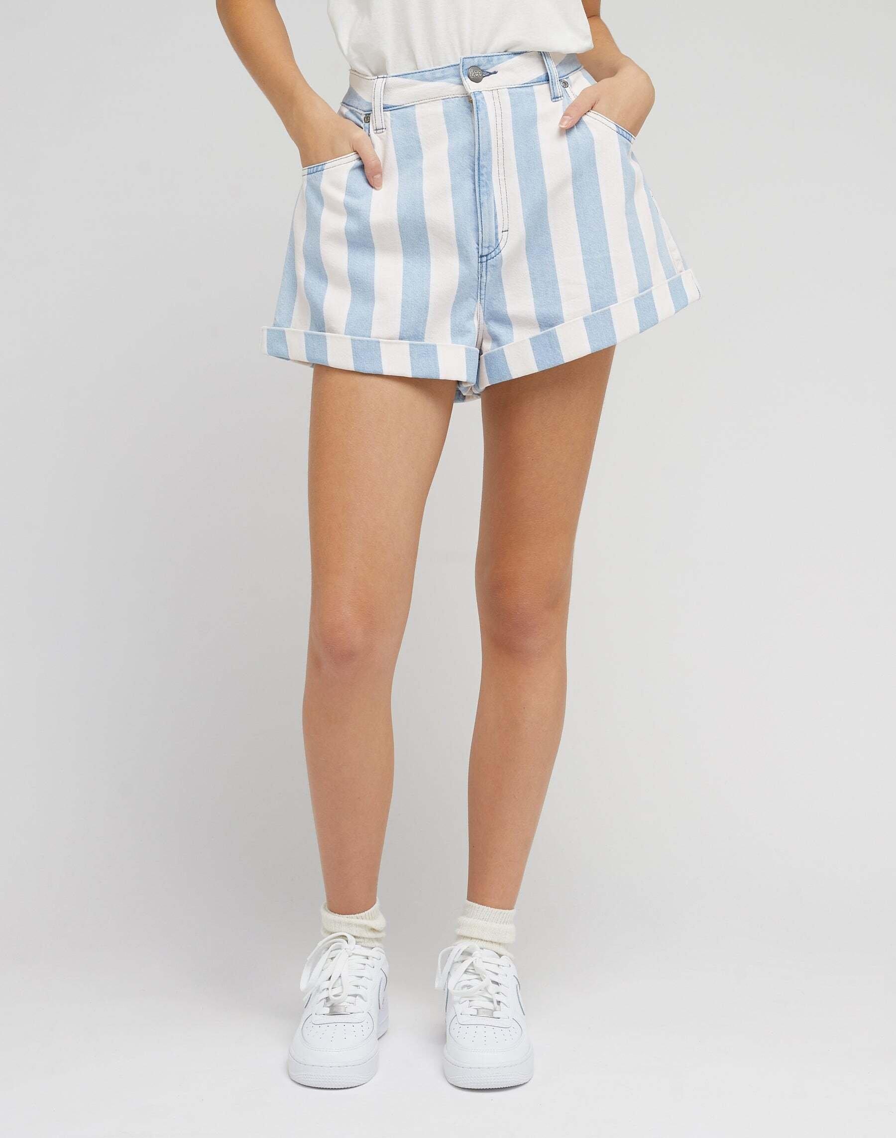 Questi shorts in denim a vita alta, splendidamente realizzati, con vestibilità ampia, orlo risvoltato e dettaglio plissettato, daranno stile all'estate. Sono realizzati in denim leggero e non elasticizzato per una sensazione autentica, facile da indossare e ariosa. Con delicate strisce blu e bianche, questi shorts sono l'aggiornamento estivo ideale con un tocco di inaspettato. I dettagli includono un bottone e rivetti in ottone anticato, mentre le cuciture sono in una tonalità tabacco a contrasto.