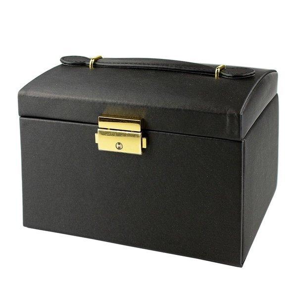 Portagioielli che si apre e si chiude con chiusura a scatto. L'armadio è realizzato in finta pelle e ha un interno morbido e spazzolato. Contiene 2 cassetti estensibili, 10 scomparti di varie dimensioni e 2 scomparti speciali con diversi piccoli scomparti divisi. L'interno del coperchio ha anche un piccolo specchio, con bottoni di fissaggio su ciascun lato dello specchio per contenere oggetti più lunghi. Il portagioie ha una maniglia sul coperchio che lo rende facile da indossare.