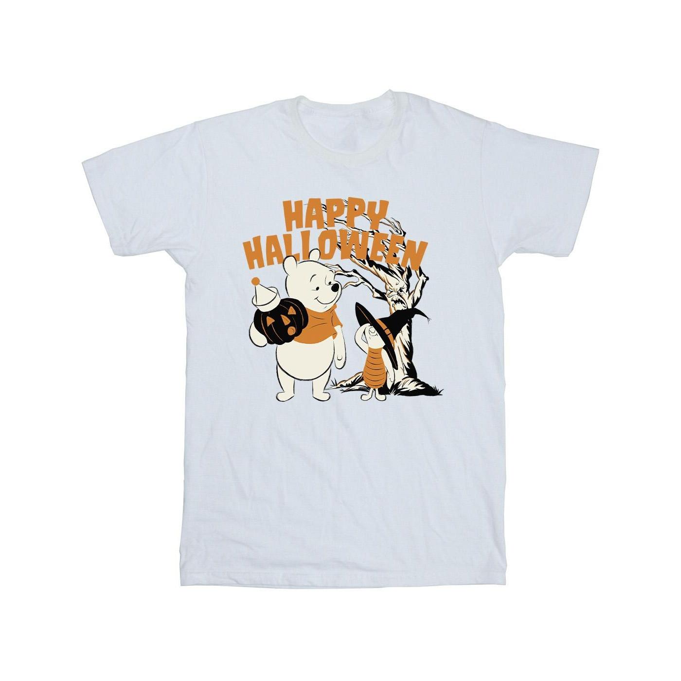 Questa T-shirt presenta una grafica festiva di Halloween con Winnie the Pooh e Pimpi. Il design include il testo "Happy Halloween" in un carattere audace e arancione, rendendola una scelta divertente per la stagione delle feste.