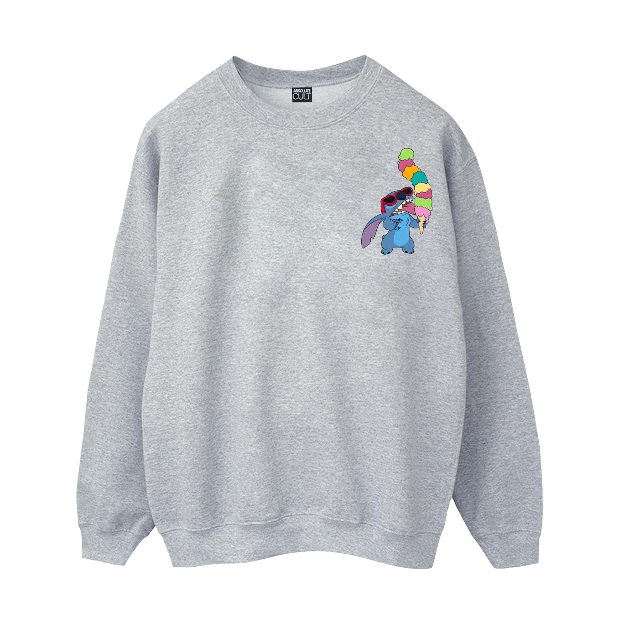 Questa comoda felpa presenta una stampa giocosa di Stitch della Disney che si gusta un enorme cono gelato. Il classico design a girocollo la rende un'aggiunta versatile a qualsiasi guardaroba casual.