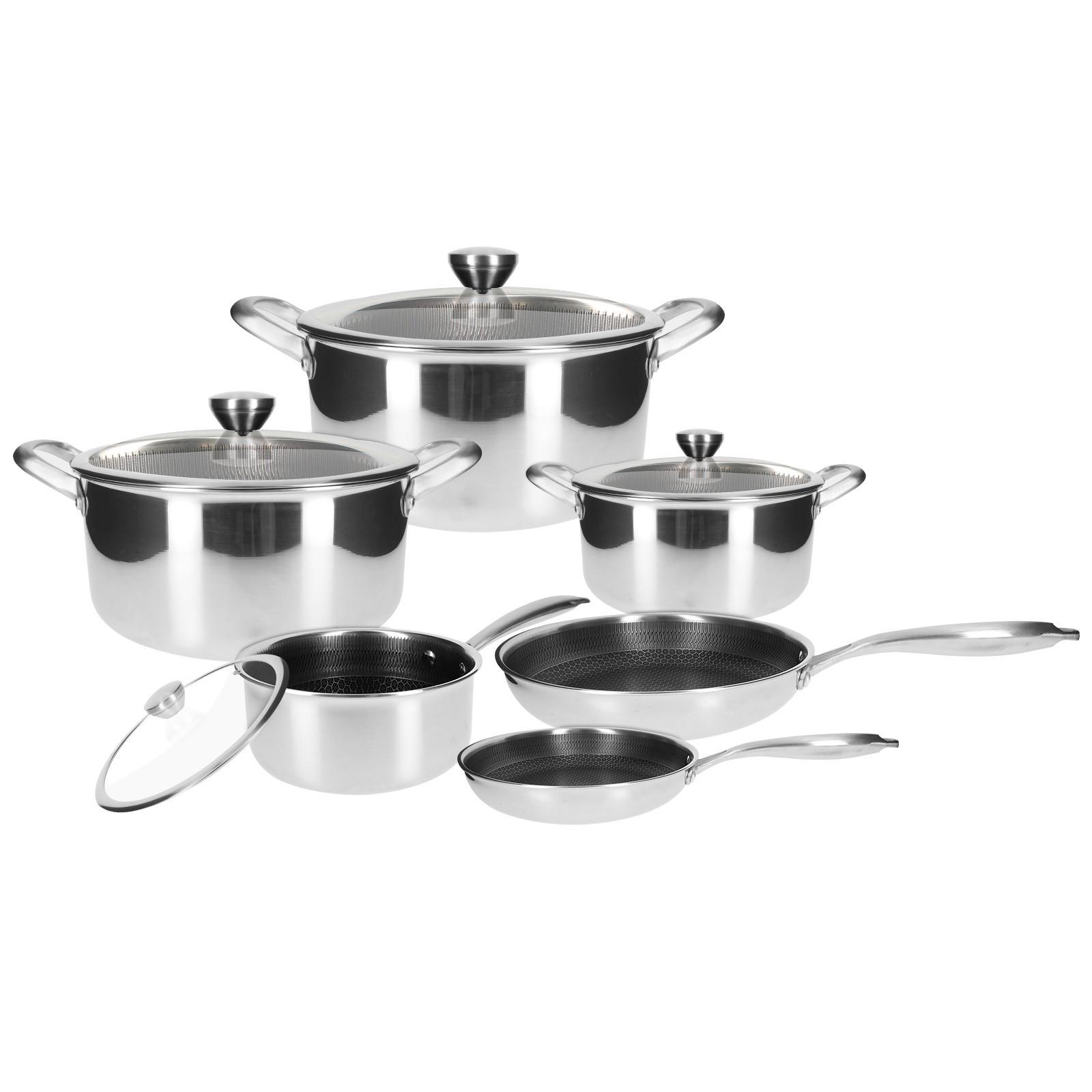 Questo set da cucina è stato progettato per migliorare le tue esigenze culinarie quotidiane. È composto da 3 pentole, una casseruola e 2 padelle. Hanno un rivestimento interno a nido d'ape 3D che conferisce loro un aspetto estetico unico. Il rivestimento esterno è in acciaio inox antigraffio. I manici sono progettati in modo ergonomico per una maggiore maneggevolezza.