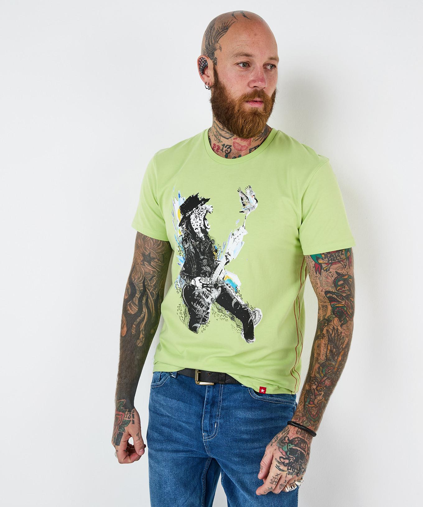Questa T-shirt presenta una sorprendente grafica di ghepardo rocker, rendendola un capo distintivo per qualsiasi guardaroba casual. Il design combina una stampa animale audace con un'estetica ispirata al rock, perfetta per esprimere uno stile unico.