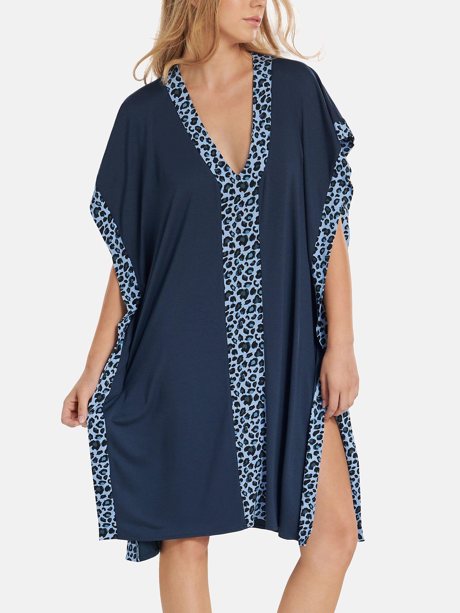 Caftano da spiaggia casual con bordi stampati sul davanti e sui lati. Ha uno scollo a V sul davanti ed è realizzato in comoda, morbida e cadente viscosa elastica con elastan. Un capo versatile da indossare in spiaggia o in piscina, o in città come abito per le vostre giornate di vacanza. Lunghezza circa 95 cm.