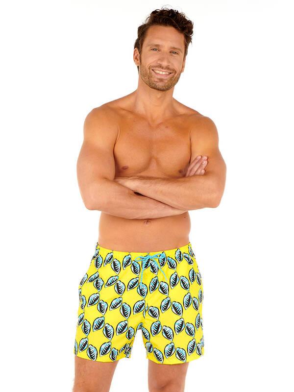 Questi pantaloncini da bagno Beach Boxer presentano un design tropicale ed esotico con conchiglie blu stilizzate su sfondo giallo. La cintura elastica a tunnel è rivestita in tessuto e include una coulisse esterna per una vestibilità regolabile e confortevole. Il taglio è più vicino alla gamba, offrendo una vestibilità slim.