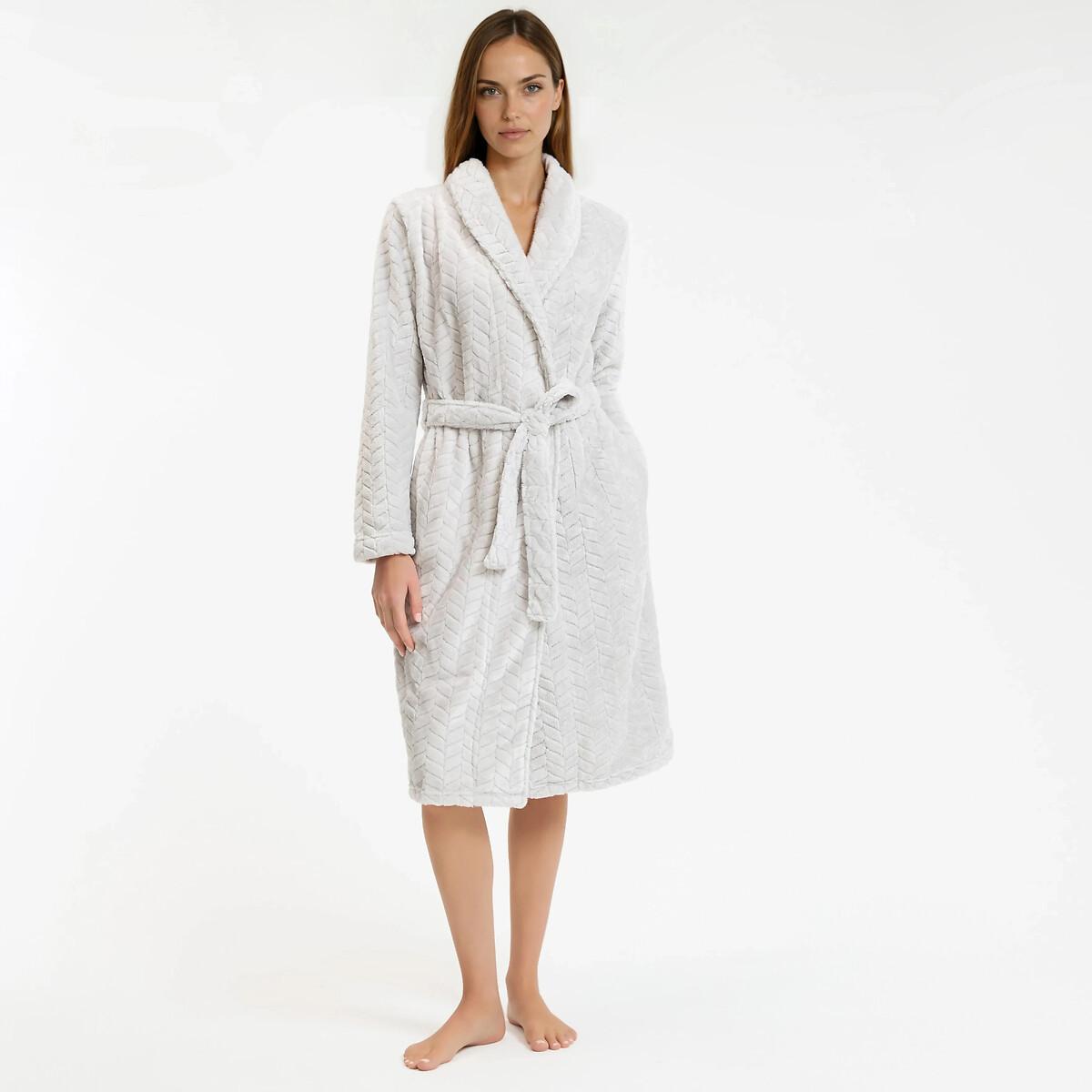Questa vestaglia offre comfort e stile, perfetta per rilassarsi a casa. Presenta una texture morbida e un design classico, rendendola un'aggiunta versatile a qualsiasi collezione di abbigliamento da casa.