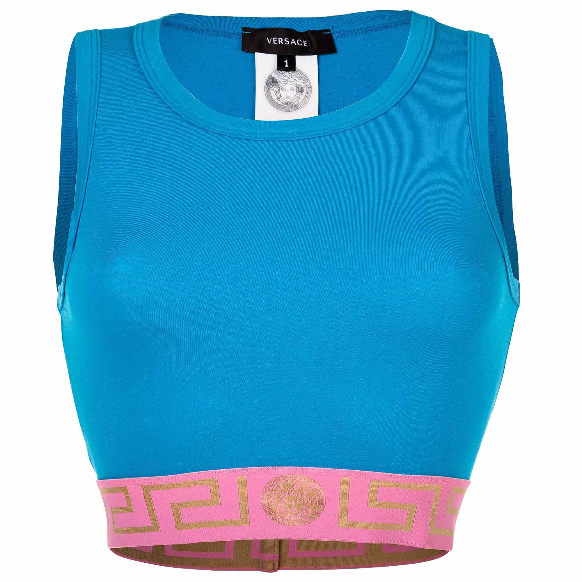 Il bustier Topeka è realizzato in materiale bi-stretch di alta qualità con cotone biologico. Questa maglietta intima corta presenta una fascia elastica in vita adornata con l'iconico motivo Greca e un motivo Medusa.