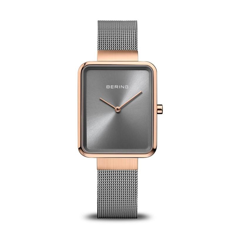 Im Mittelpunkt dieses Kunstwerks steht das für BERING charakteristische puristische Design. Klare Linien und eine reduzierte Formensprache bestimmen den Stil dieser außergewöhnlichen Uhr. Sie ist nicht nur ein Instrument zur Zeitmessung, sondern ein Kunstwerk, das Understatement und auffallende Eleganz meisterhaft vereint. Das Geheimnis ihrer Langlebigkeit und Schönheit liegt in der Verwendung hochwertiger Materialien. Das Gehäuse aus fein gebürstetem und poliertem Edelstahl in strahlendem Rosegold verleiht der Uhr eine luxuriöse und doch zurückhaltende Ausstrahlung. Die Kombination von Rosegold und Grau sorgt nicht nur für eine glänzende Optik, sondern auch für Robustheit und Langlebigkeit.