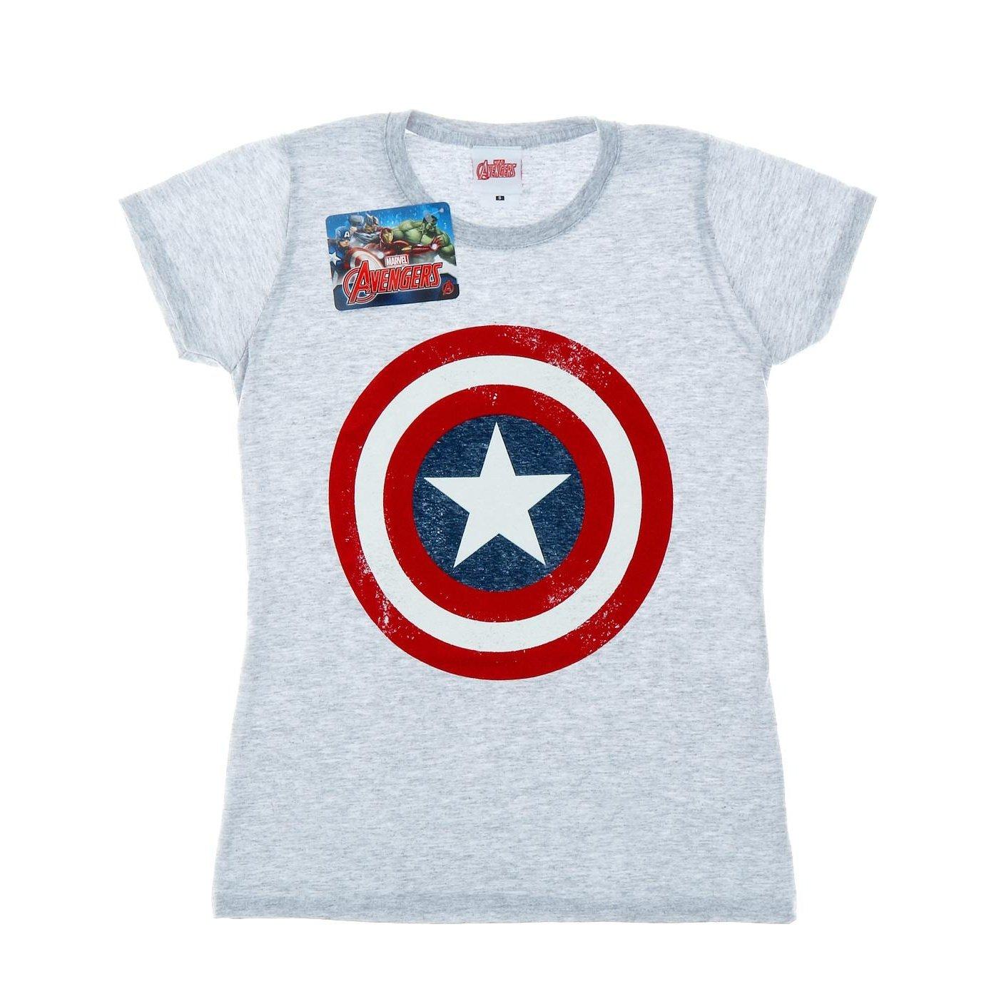 Questa T-shirt presenta un classico girocollo e maniche corte. La parte anteriore è decorata con una stampa effetto invecchiato dell'iconico scudo di Captain America, aggiungendo un tocco di stile da supereroe.
