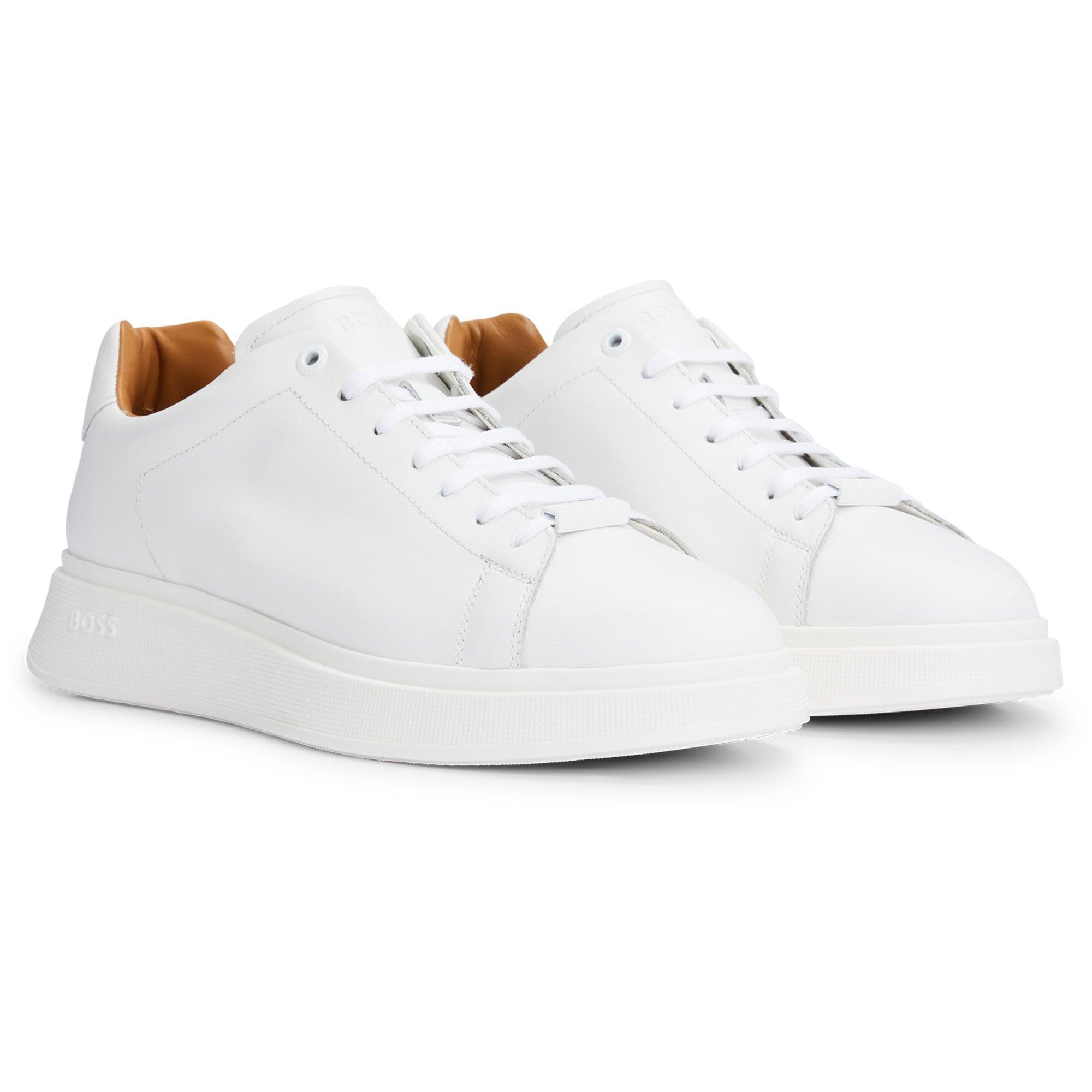 Eleganti scarpe da ginnastica basse da uomo del marchio BOSS. Comode scarpe da ginnastica basse con lacci in pelle lucida e logo in rilievo sulla suola. Alta qualità.