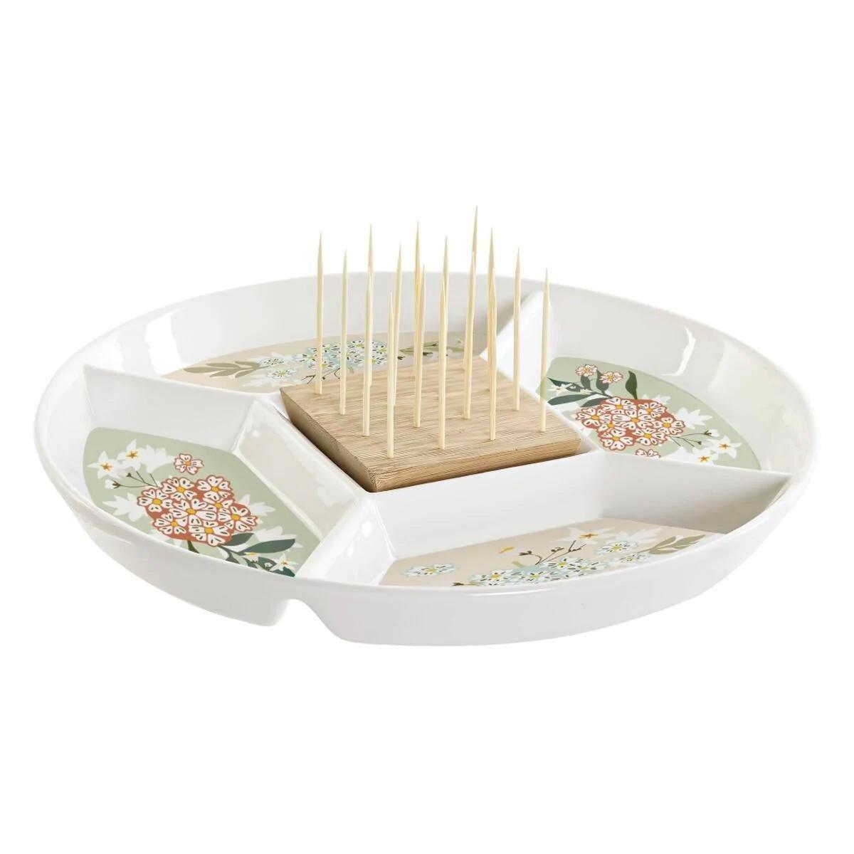 Questo piatto è perfetto per servire antipasti, antipasti o tartine. Il piatto ha un design accattivante con motivo floreale e 5 sezioni, di cui la sezione centrale è dotata di stuzzicadenti removibili.