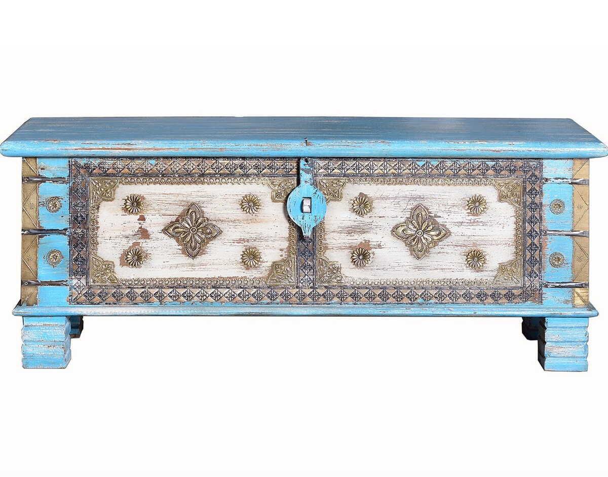 Cassapanca in legno di mango con dettagli in bronzo e grande capacità. Fronte con applicazioni in metallo, retro blu.