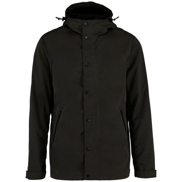 Questa giacca con cappuccio ecologica offre un mix di stile e funzionalità. Presenta un'abbottonatura a tutta lunghezza per una chiusura sicura e un cappuccio con coulisse regolabili per proteggere dagli elementi. La giacca è progettata pensando alla praticità, includendo tasche laterali per maggiore comodità.