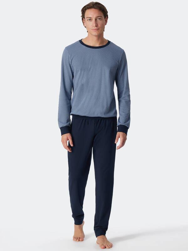 Questo pigiama offre comfort e stile per rilassarsi a casa. Il set include una maglia a maniche lunghe con un motivo sottile e pantaloni a tinta unita, entrambi con polsini per una vestibilità sicura e confortevole.
