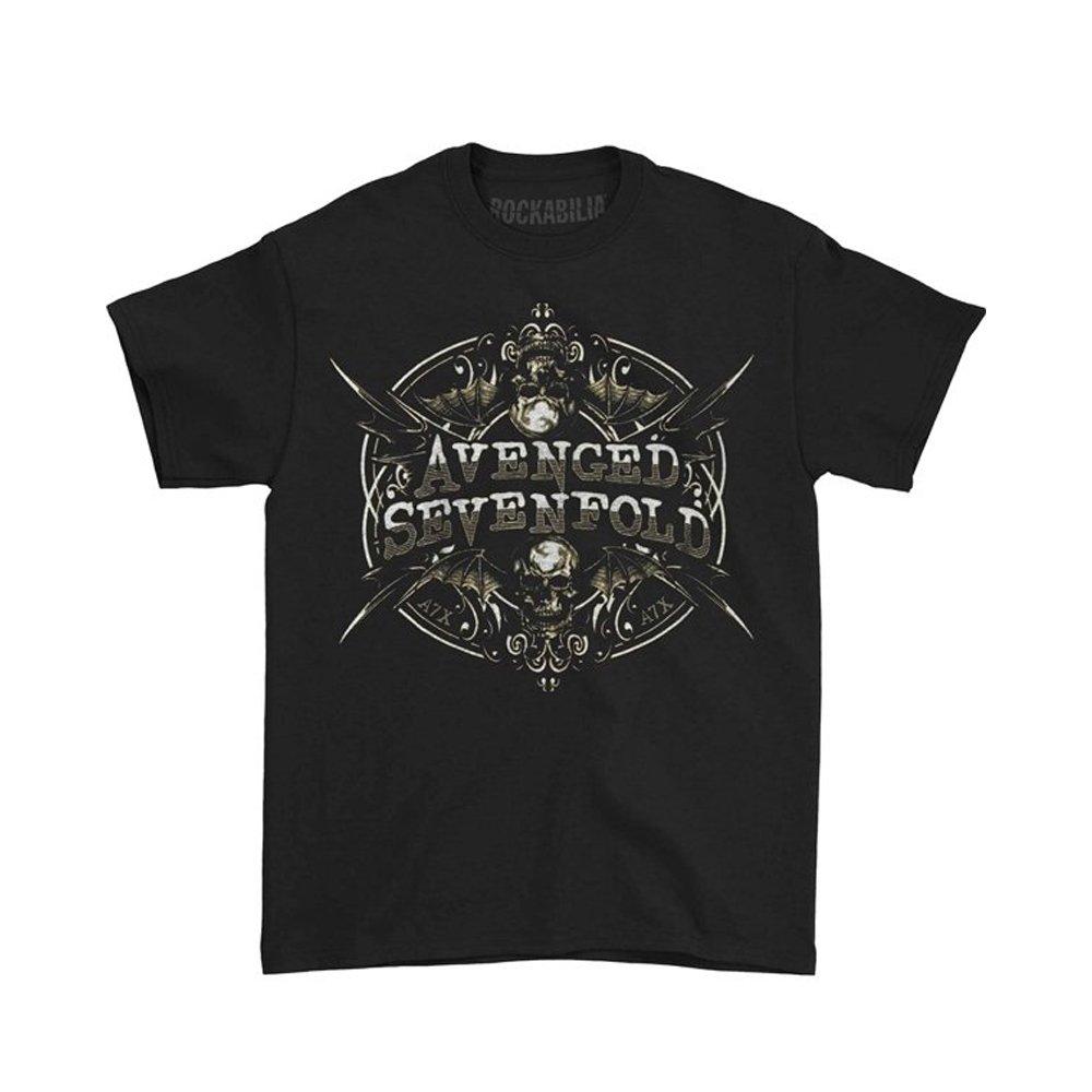 Questa T-shirt presenta una sorprendente stampa grafica della band Avenged Sevenfold. Il design include il nome della band ben visibile, incorniciato da intricati elementi di ispirazione gotica, teschi e lame incrociate, creando un look audace e distintivo.