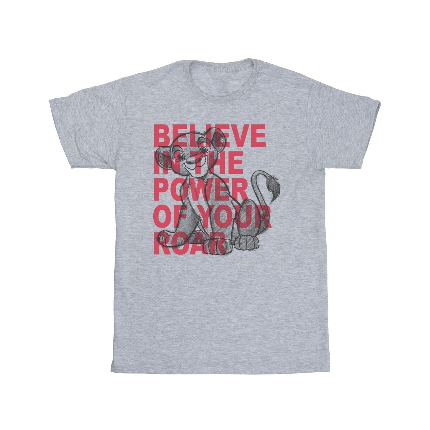 Questa T-shirt presenta una stampa grafica ispirata a Il Re Leone della Disney. Il design mostra un giovane Simba con la frase motivazionale "BELIEVE IN THE POWER OF YOUR ROAR" in lettere rosse audaci.