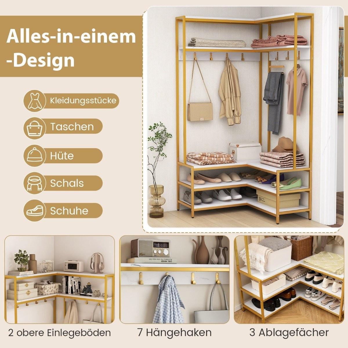 L'appendiabiti a forma di L è una meraviglia multifunzionale, che combina le caratteristiche di un appendiabiti, di una scarpiera, di una scarpiera e di un ripiano espositivo per soddisfare le tue esigenze quotidiane. Il suo design compatto si adatta perfettamente agli angoli o ai piccoli spazi, rendendolo una soluzione di archiviazione ideale per le case con spazio limitato. Il design aperto consente un facile accesso ai tuoi oggetti, mentre la superficie liscia garantisce una pulizia senza sforzo.