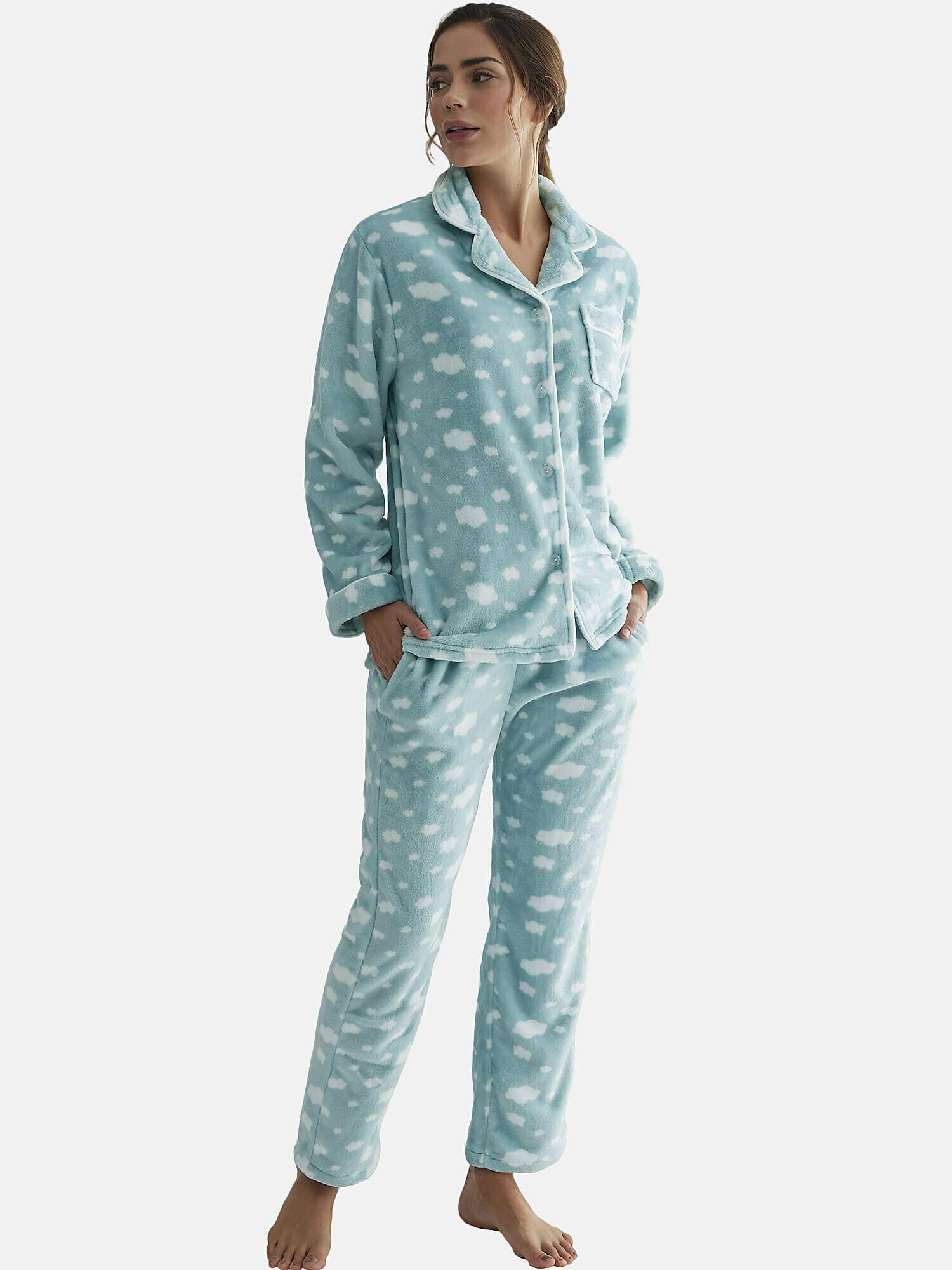 I pantaloni sono dritti e possono essere regolati in vita con una coulisse. Sono dotati di pratiche tasche laterali. Il top è una camicia a maniche lunghe che si chiude sul davanti con un'abbottonatura. Le maniche sono strette ai polsini e un taschino orna la parte anteriore del busto. Un finissimo piping in colore contrastante rifinisce i lati della camicia e il taschino. Questo pigiama è stampato su tutta la superficie con motivi di nuvole.