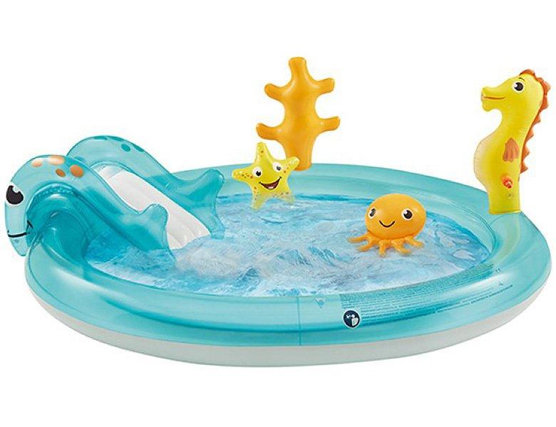 Dieser kinderfreundliche Pool ist aus hochwertiger PVC-Folie gefertigt und bietet mit seinen Massen von 198 x 150 x 18 cm ausreichend Platz zum Spielen und Plantschen. Die integrierte Rutsche sorgt für zusätzlichen Spass und Action. Einfach den Gartenschlauch anschliessen, um die Spritzfunktion zu aktivieren und an heissen Sommertagen für Abkühlung zu sorgen. Ideal für Kinder ab 1 Jahr.