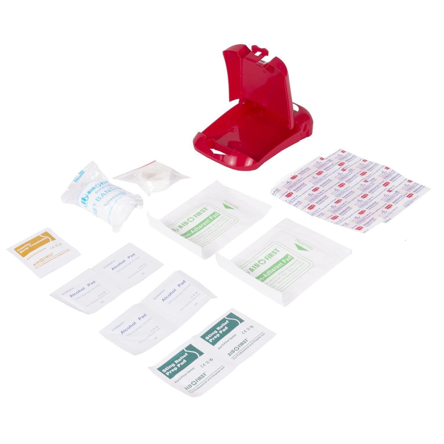 Un kit di pronto soccorso versatile e compatto, ideale quando sei in viaggio. Il kit contiene otto cerotti resistenti all'acqua, quattro salviettine umidificate sterilizzanti a base di alcol, due salviette per alleviare le punture di insetto, una garza, una salvietta di sapone Castilet, un rotolo di nastro chirurgico e due compresse.