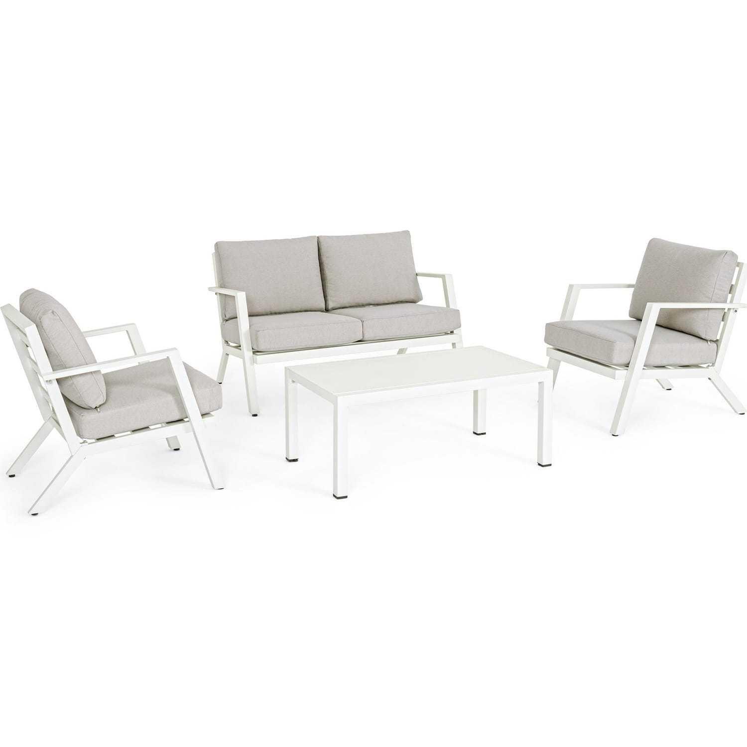 Gruppo di sedute in tessuto e alluminio, colore bianco, 2 poltrone da giardino: 68 x 81,5 x 76 cm / divano da giardino: 127 x 81,5 x 76 cm / tavolino: 100 x 60 x 42 cm