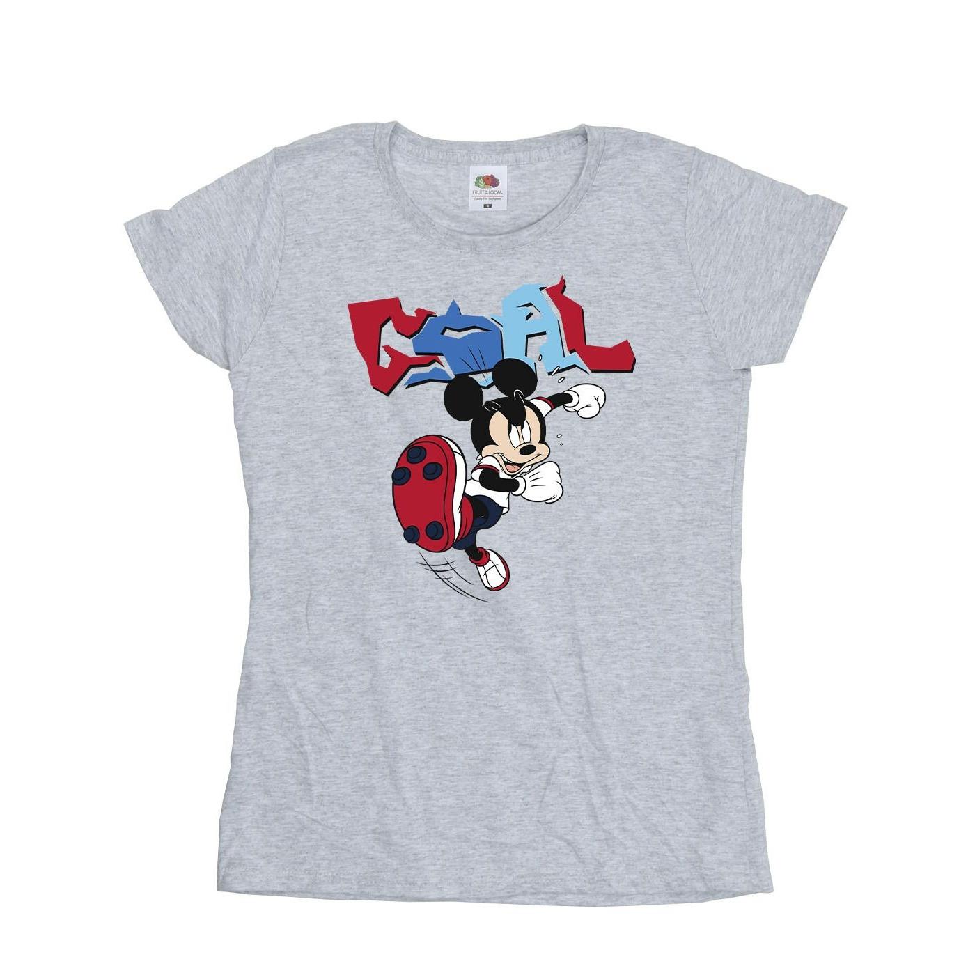 Questa T-shirt presenta una grafica giocosa di Topolino in una posa dinamica, pronto a colpire una palla, con la parola "GOAL" ben visibile in un carattere audace e stilizzato. Il classico girocollo e le maniche corte offrono una vestibilità comoda e versatile, rendendola adatta per l'uso quotidiano.