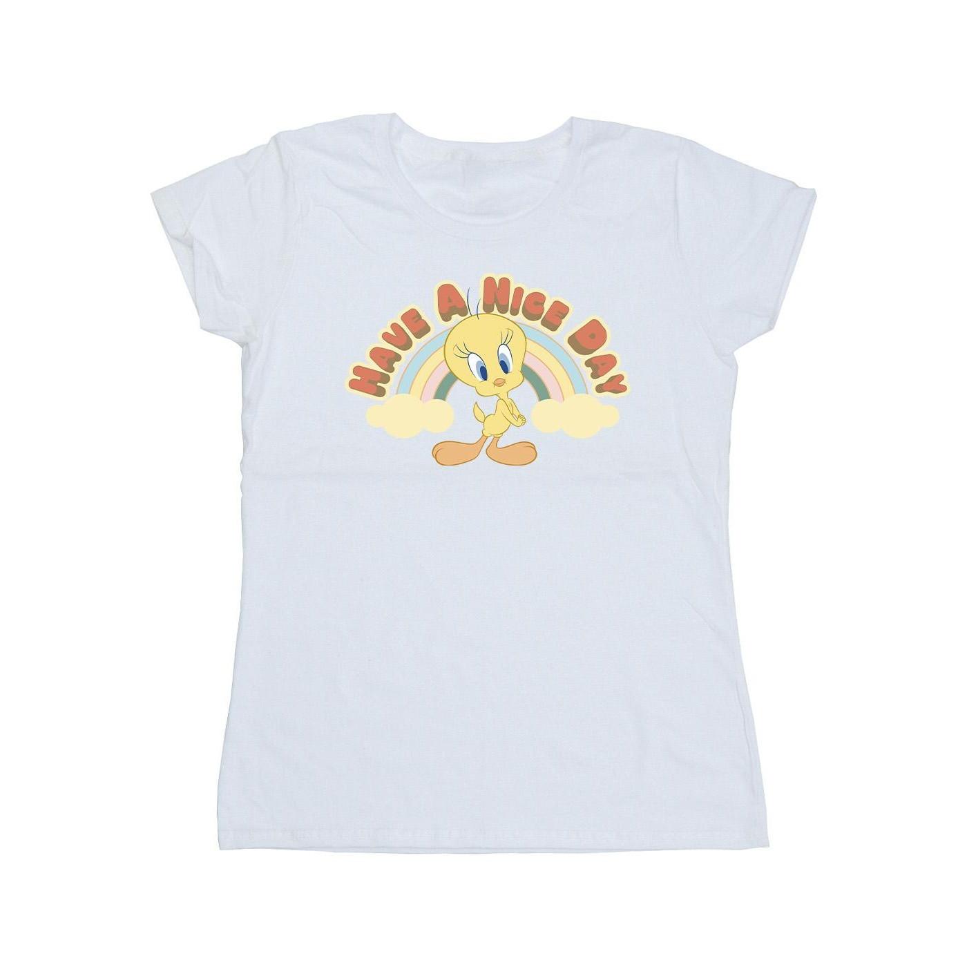 Questa T-shirt presenta una grafica giocosa di Titti l'uccellino con un arcobaleno e la frase "Have A Nice Day". È un'aggiunta comoda ed elegante a qualsiasi guardaroba casual.